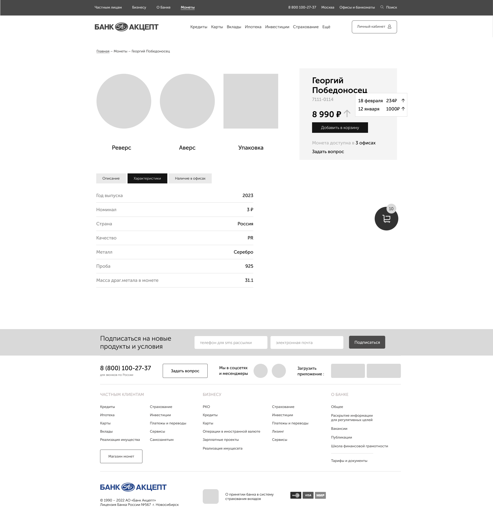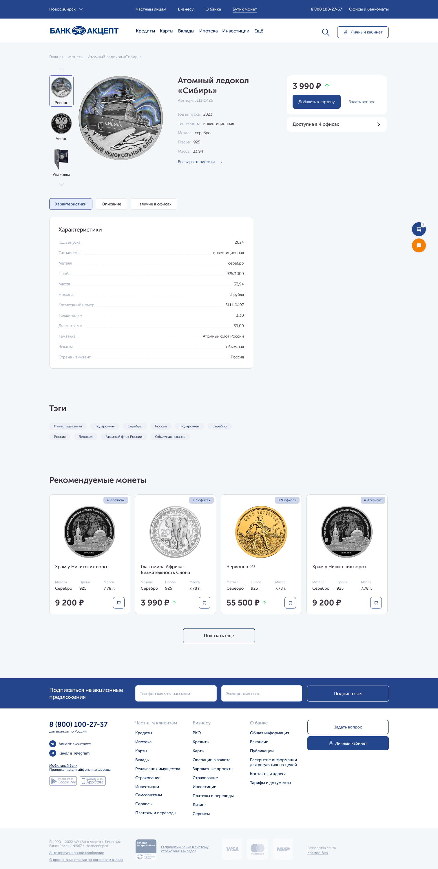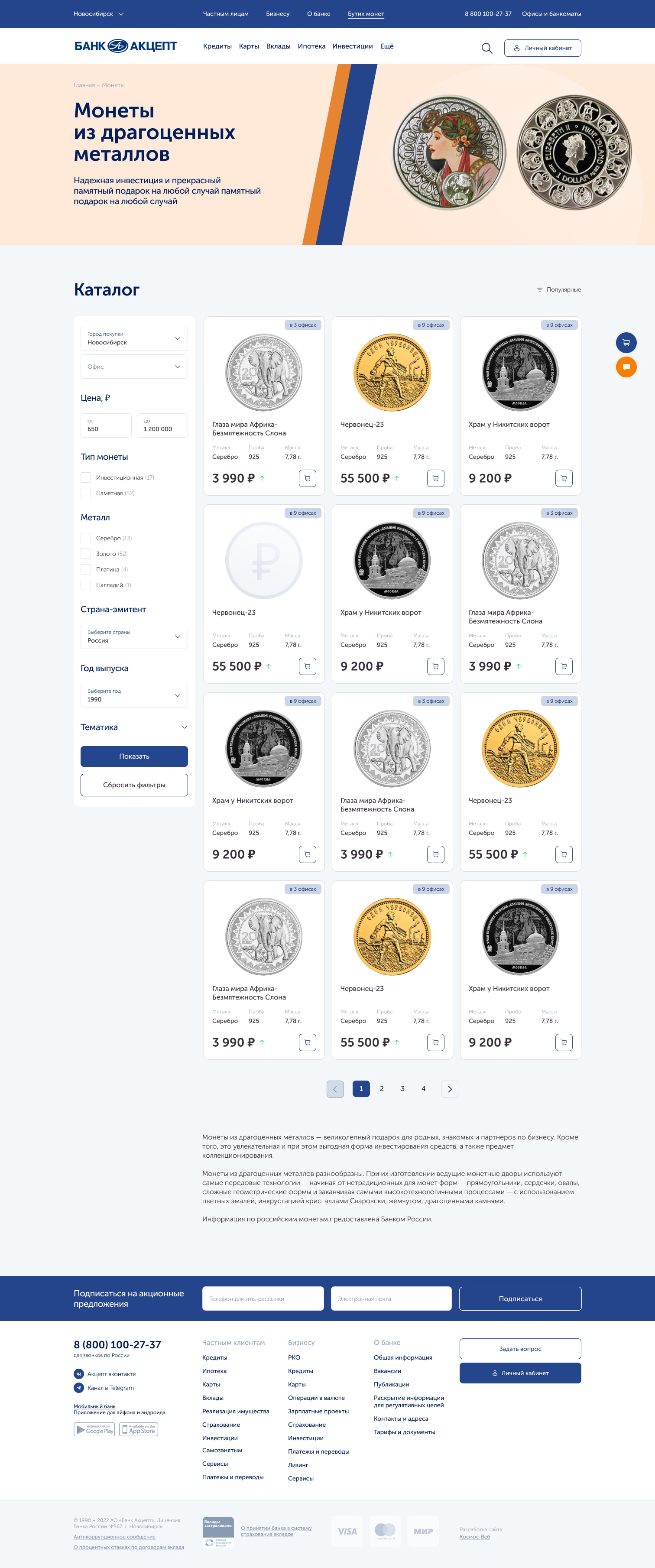 The bank’s website already featured a showcase of investment and commemorative coins. The client asked us to completely rethink the page and turn it into a full-fledged online store.