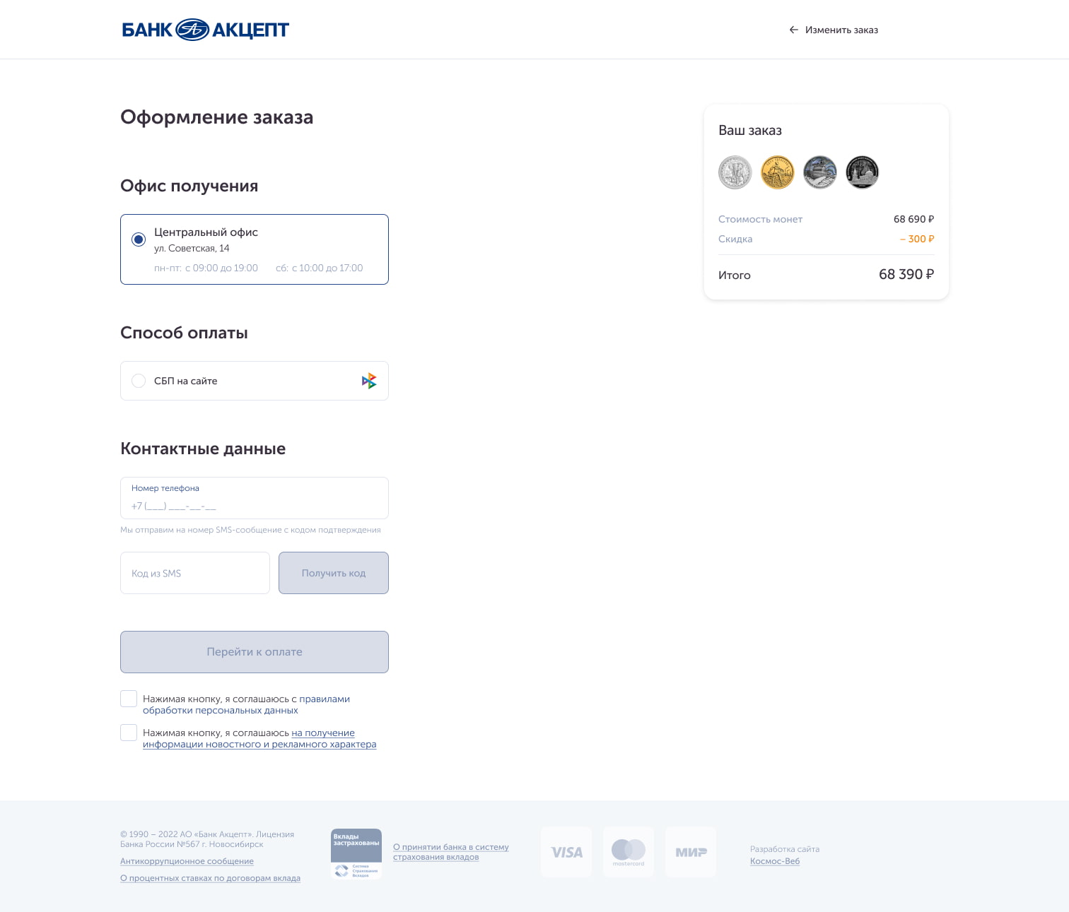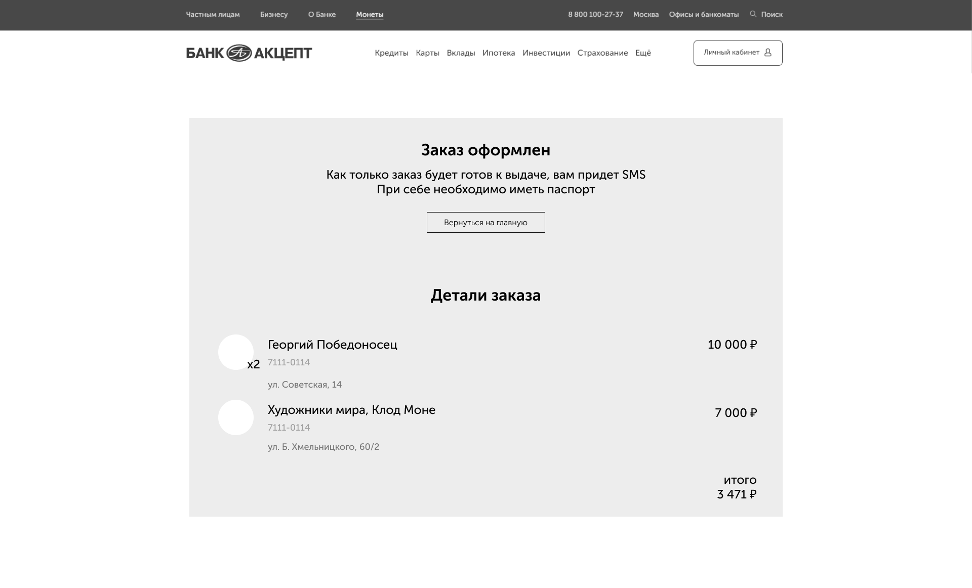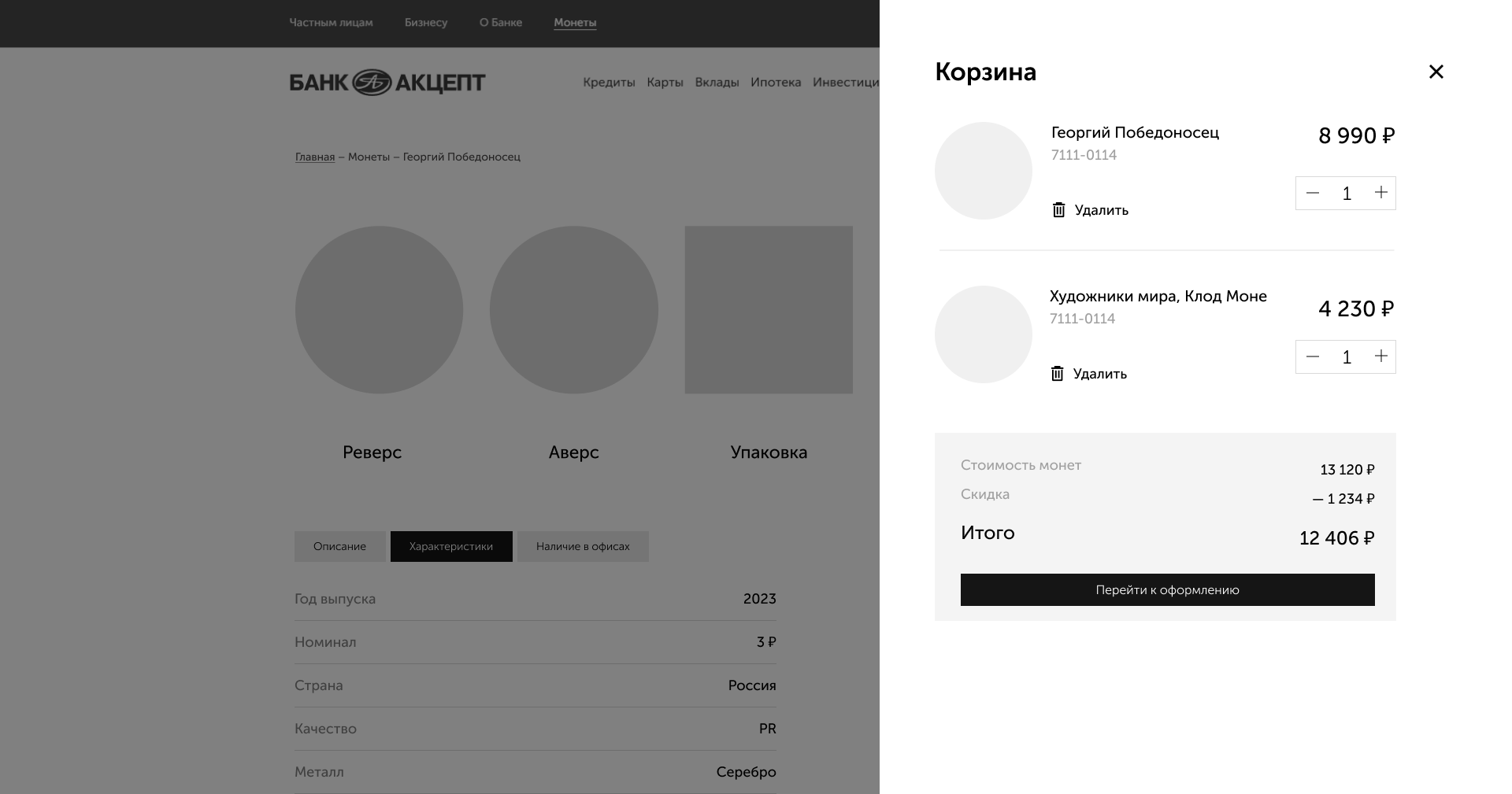 The bank’s website already featured a showcase of investment and commemorative coins. The client asked us to completely rethink the page and turn it into a full-fledged online store.