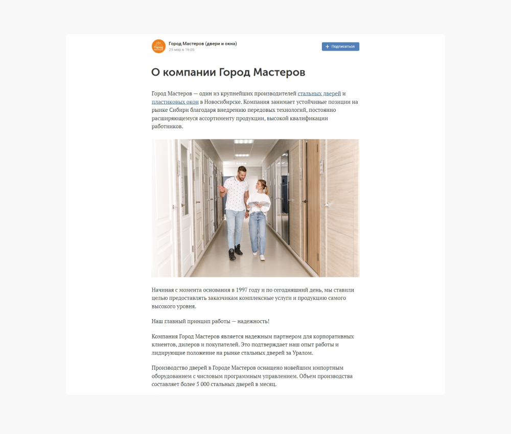 The City of Masters is a manufacturer of entrance doors and plastic windows in Novosibirsk with 25 years of experience.