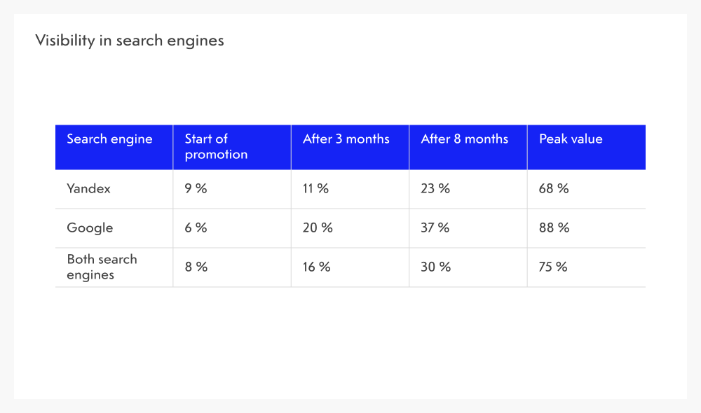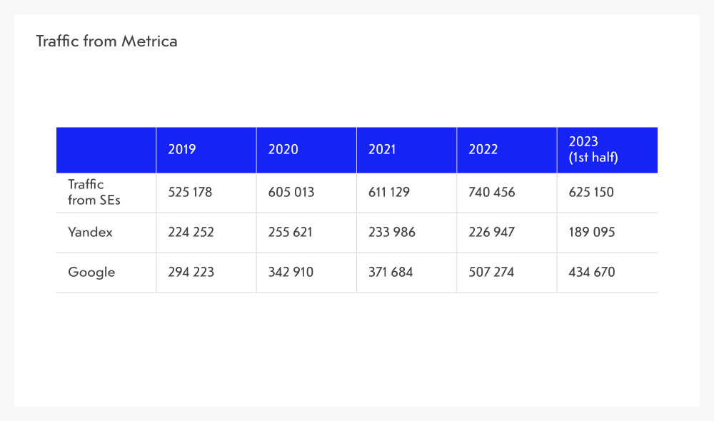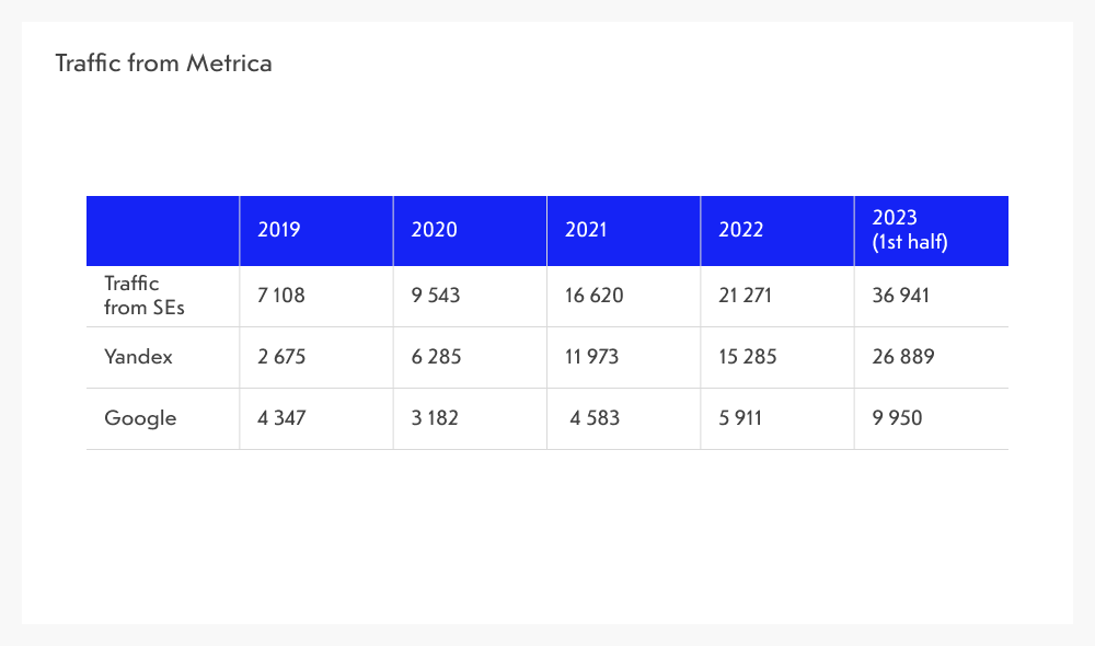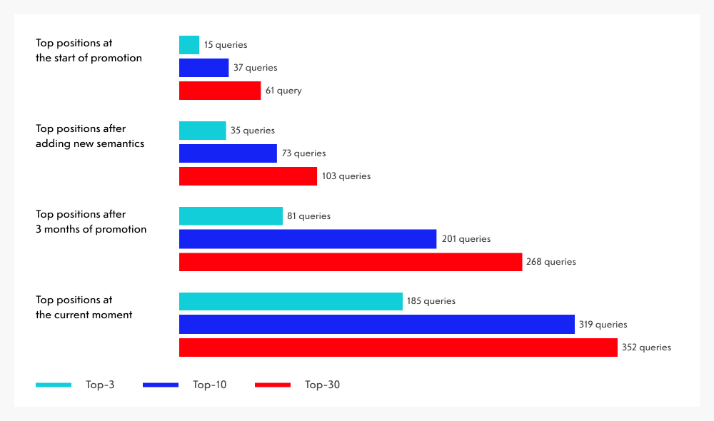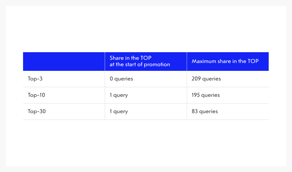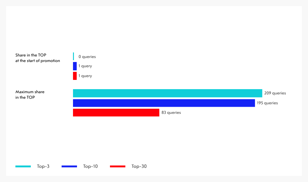 We received an increase in traffic due to an increase in the semantic core and the share of queries in the TOP 10.