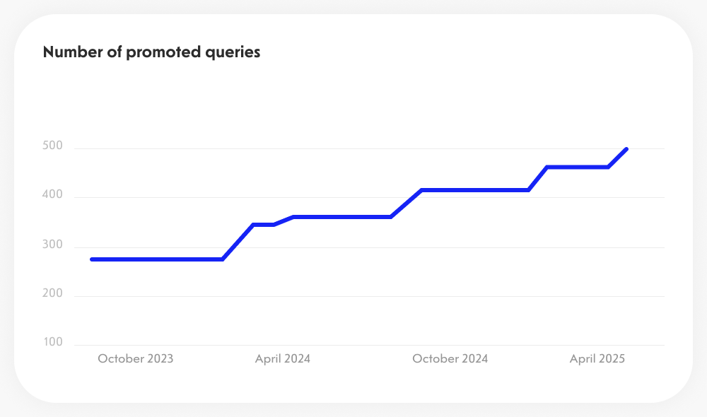 We identified the most high-priority services and pages for promotion and then worked on the semantic core, which initially included 283 search queries. Later, together with the client, we gradually expanded the semantic core, reaching 483 queries by April 2025.