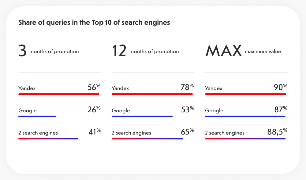 The maximum goal is to reach the Top 3 and then secure the first position. Every month, we get closer to having 100% of target queries ranked at the top.
