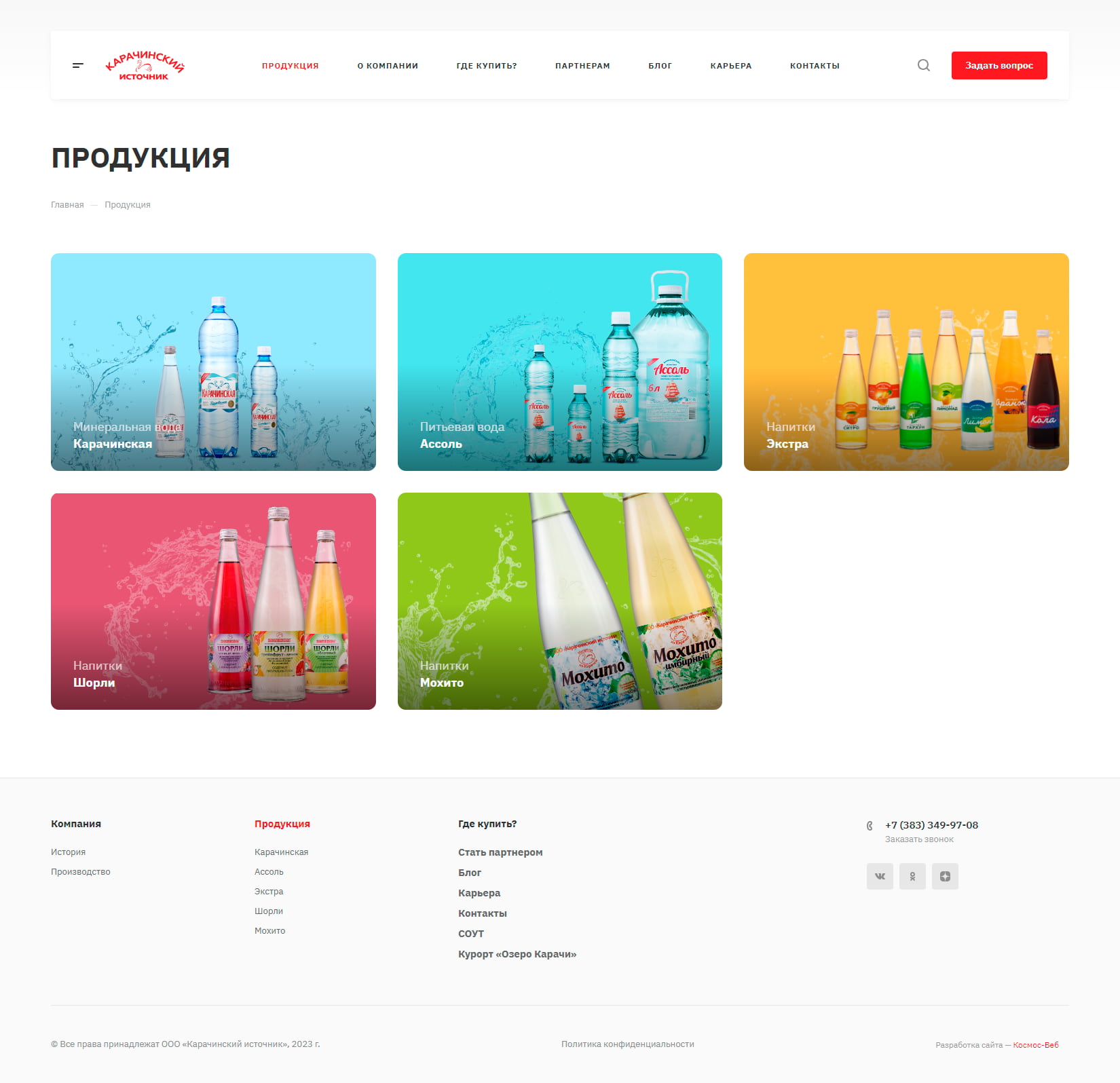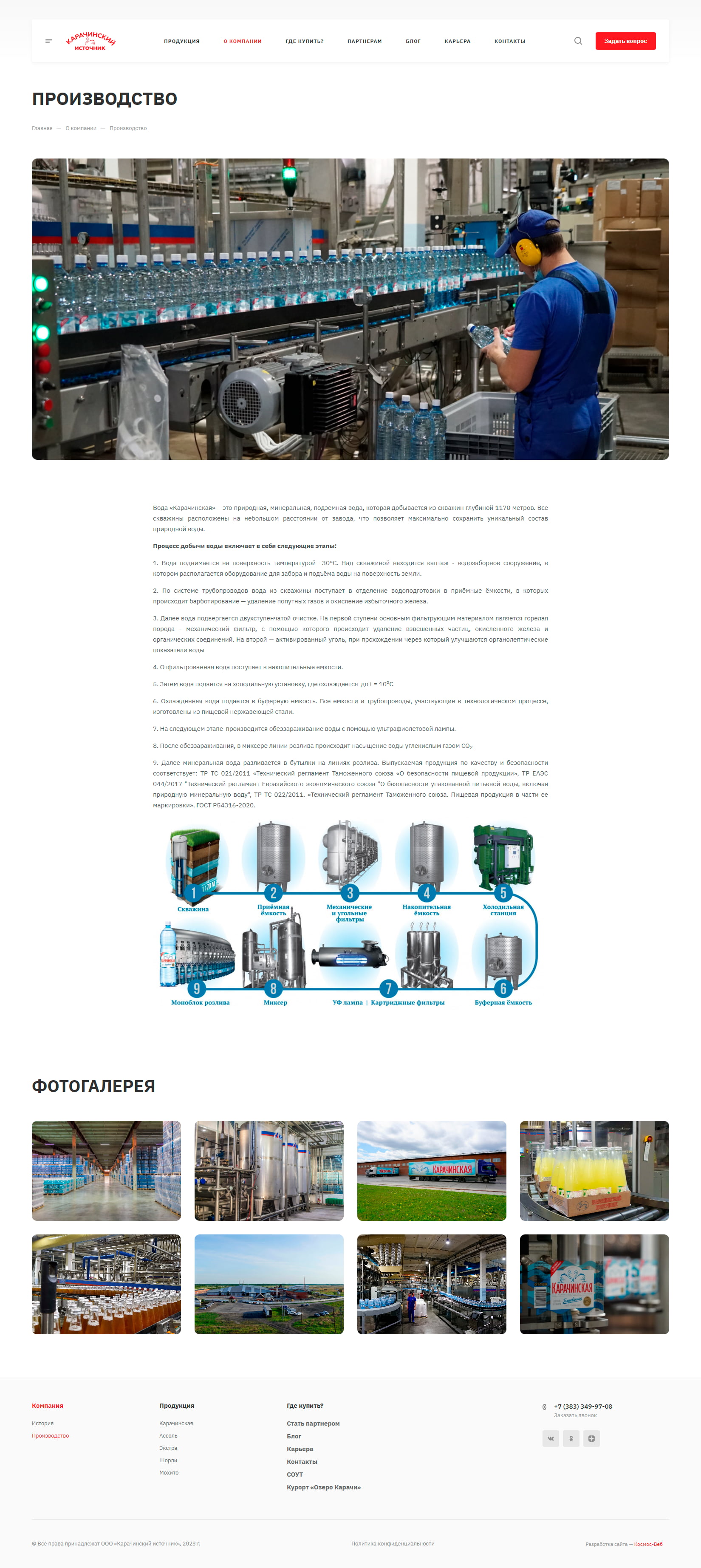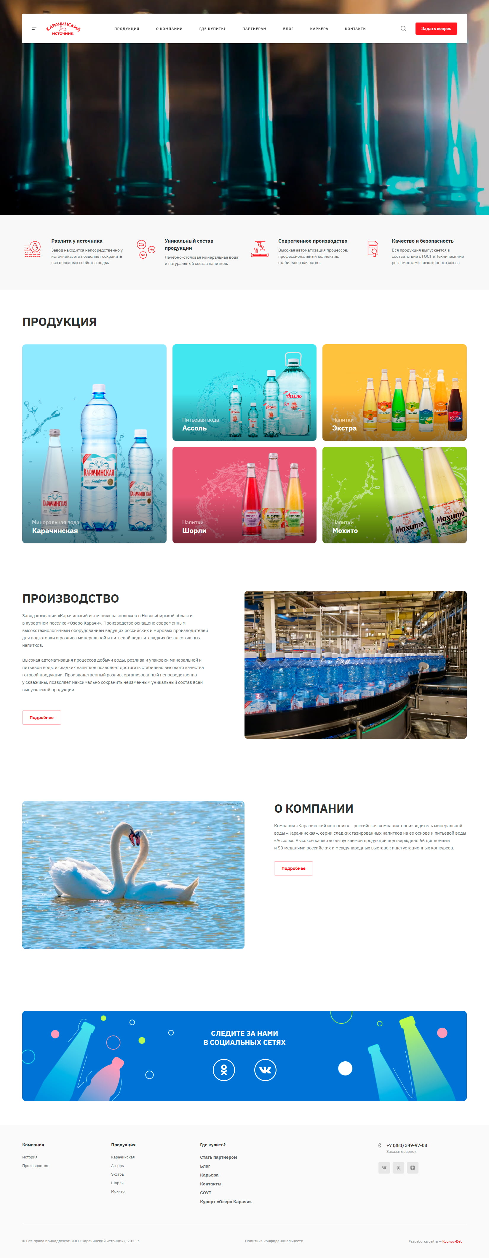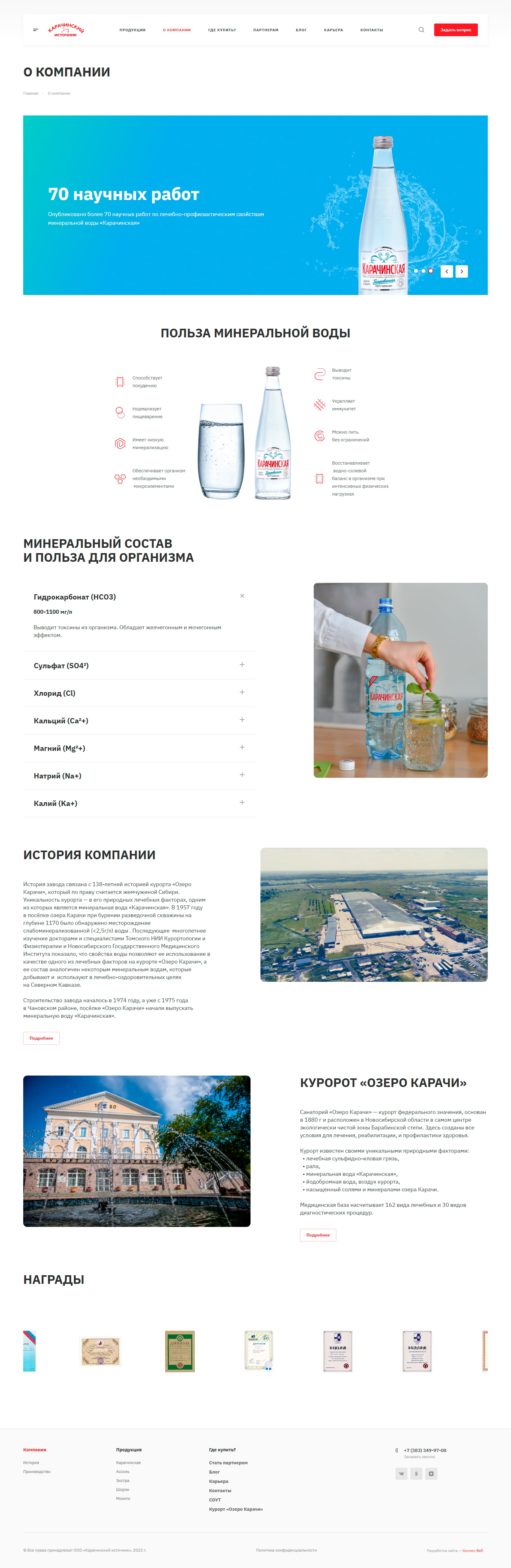 The timeline and other resources were limited, so this time we couldn’t afford the luxury of custom design. However, we still needed to develop a beautiful website that would leave a lasting impression on users and effectively showcase the factory’s products, including the legendary 'Karachinskaya' mineral water.