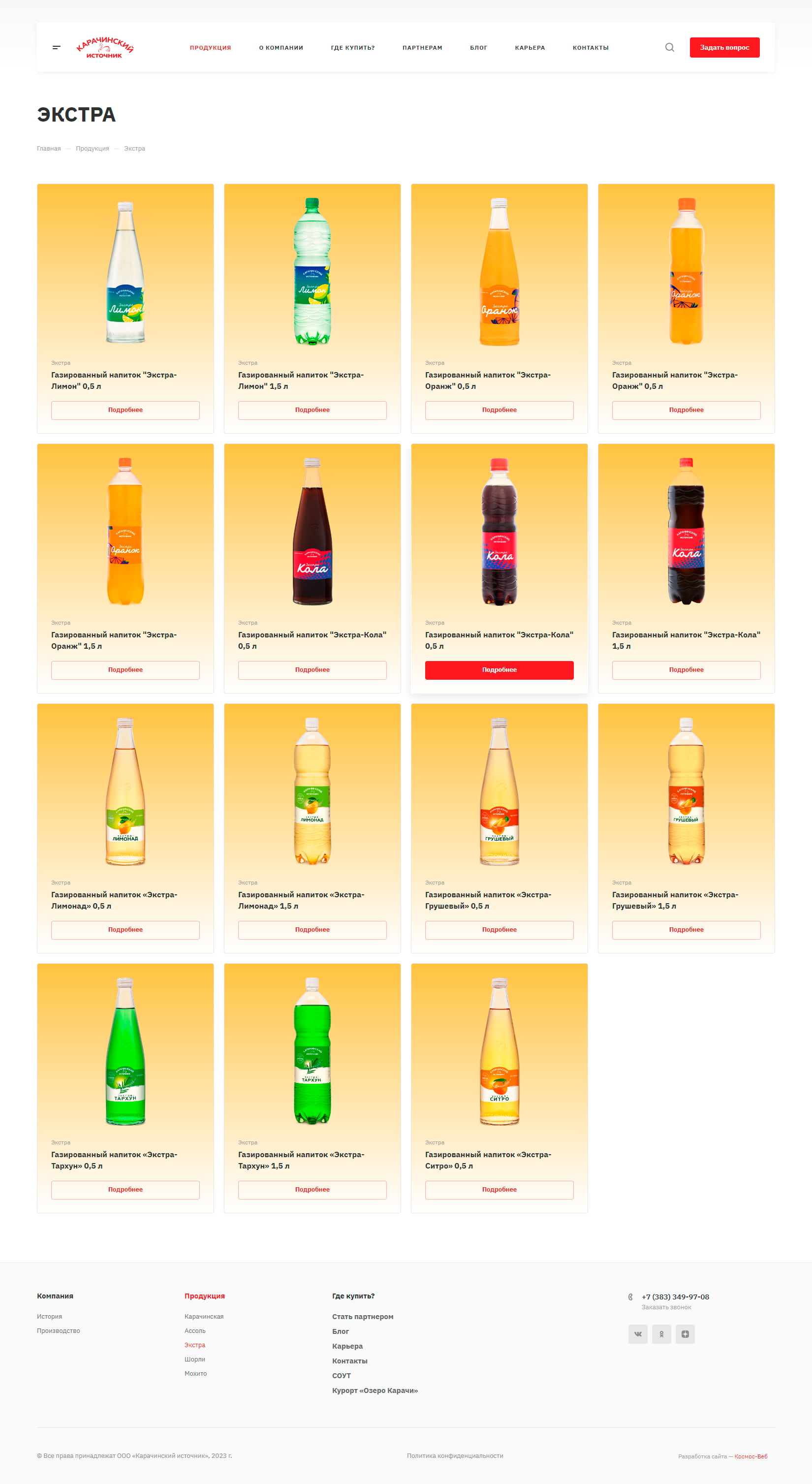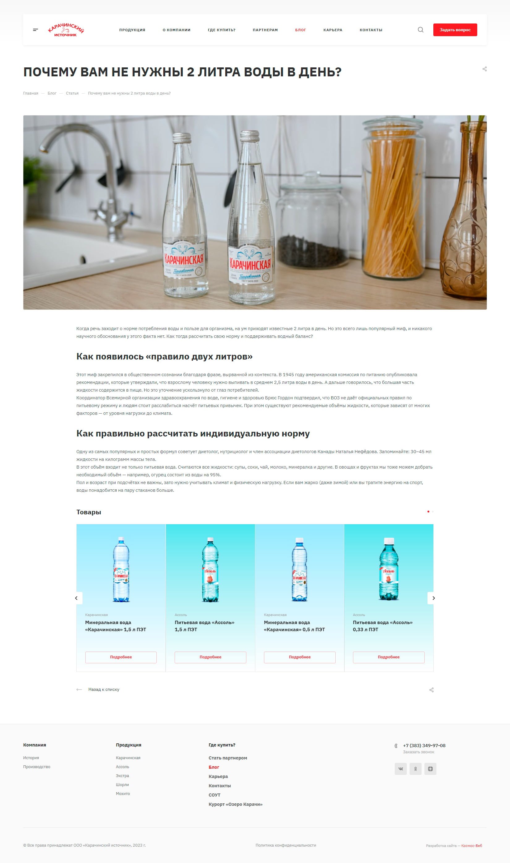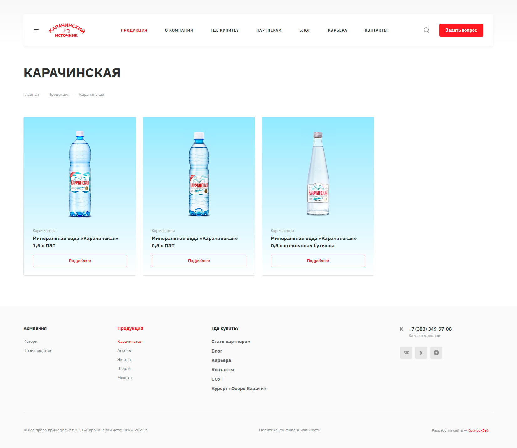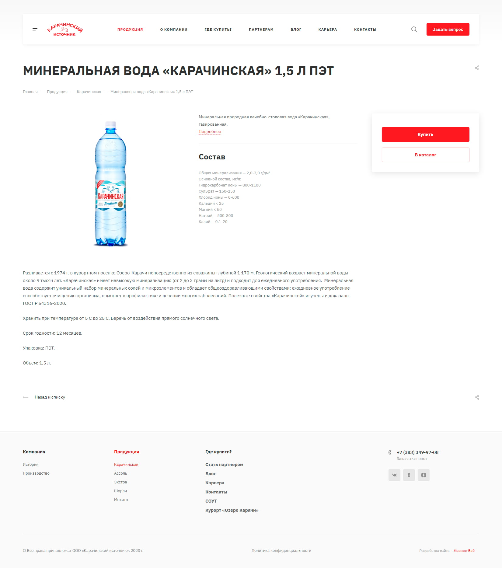 The timeline and other resources were limited, so this time we couldn’t afford the luxury of custom design. However, we still needed to develop a beautiful website that would leave a lasting impression on users and effectively showcase the factory’s products, including the legendary 'Karachinskaya' mineral water.