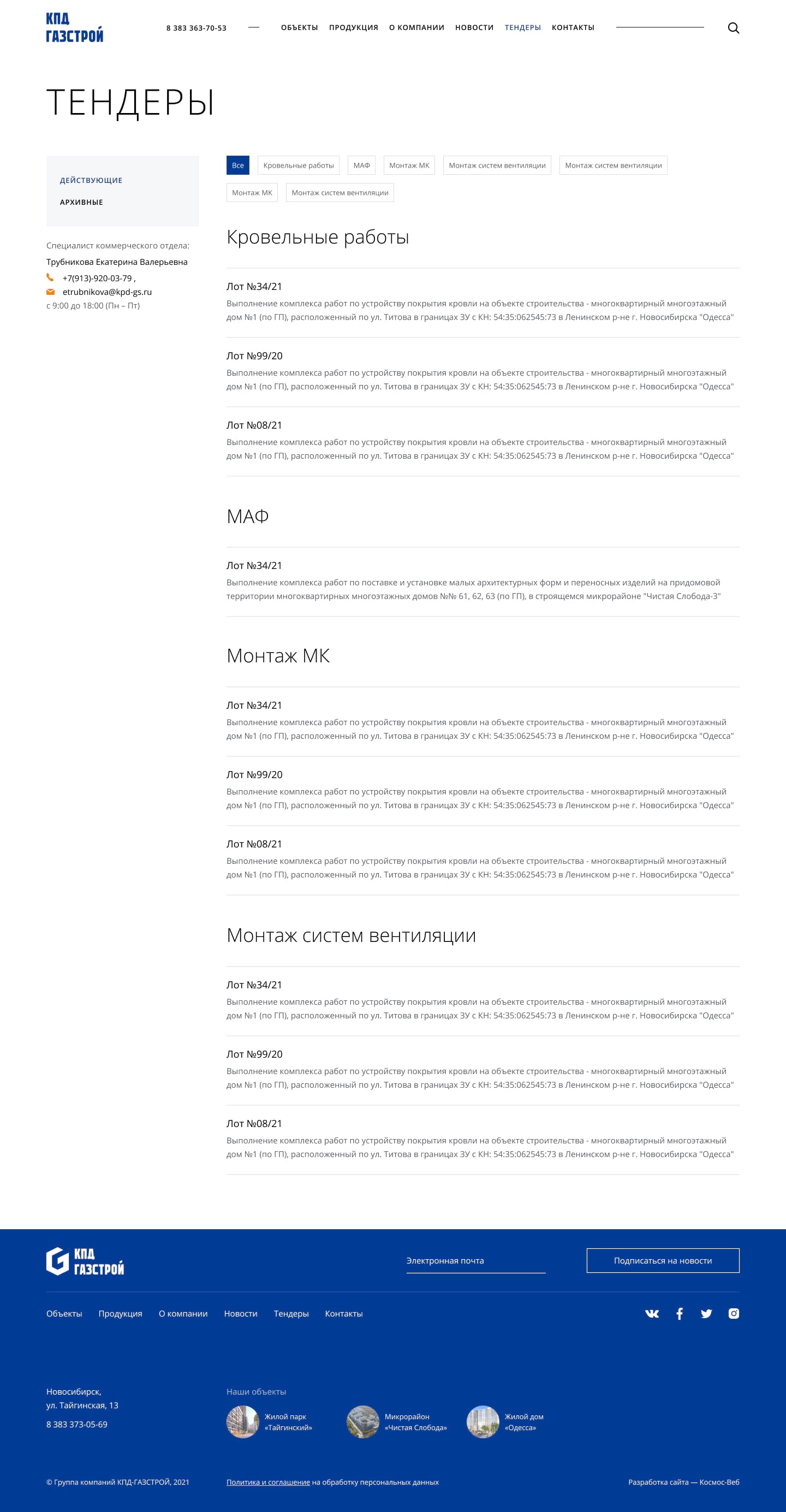 The website includes all the essential sections: ’About the Company,’ services catalog, project portfolio, tenders, news, and more.