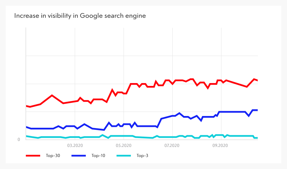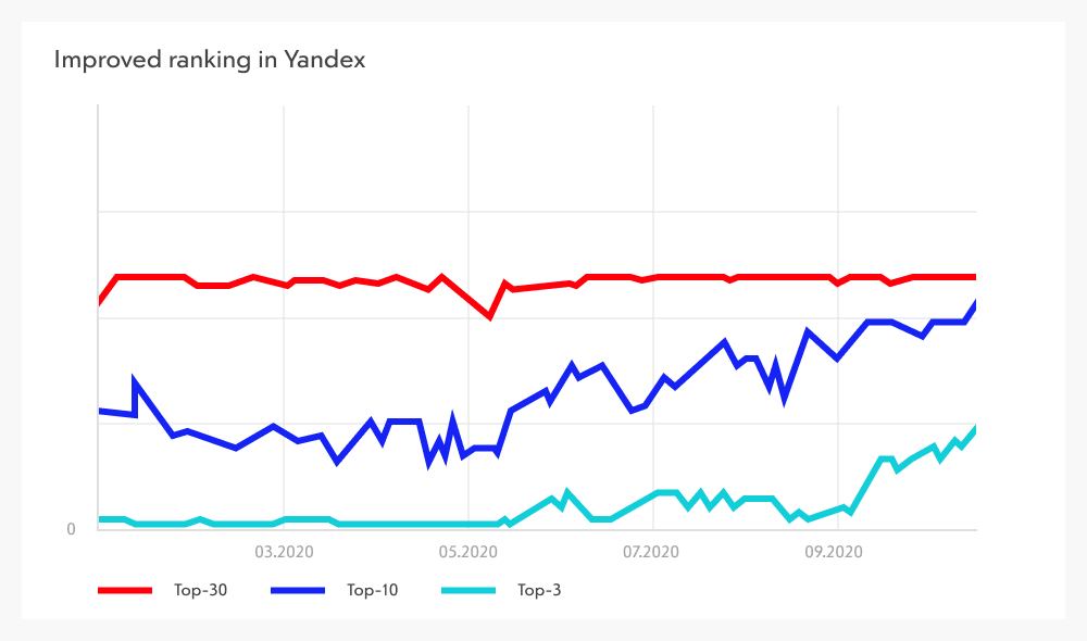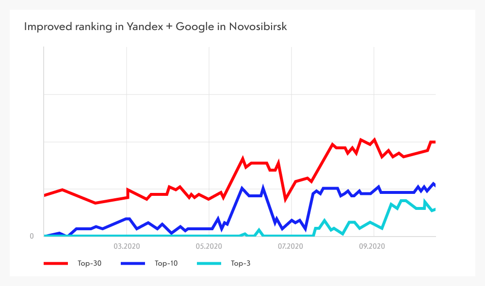 With each passing month, more and more search queries reached TOP positions in Yandex and Google. SEO is a long-term game — results don’t happen overnight, but once achieved, they can be solidified and maintained.