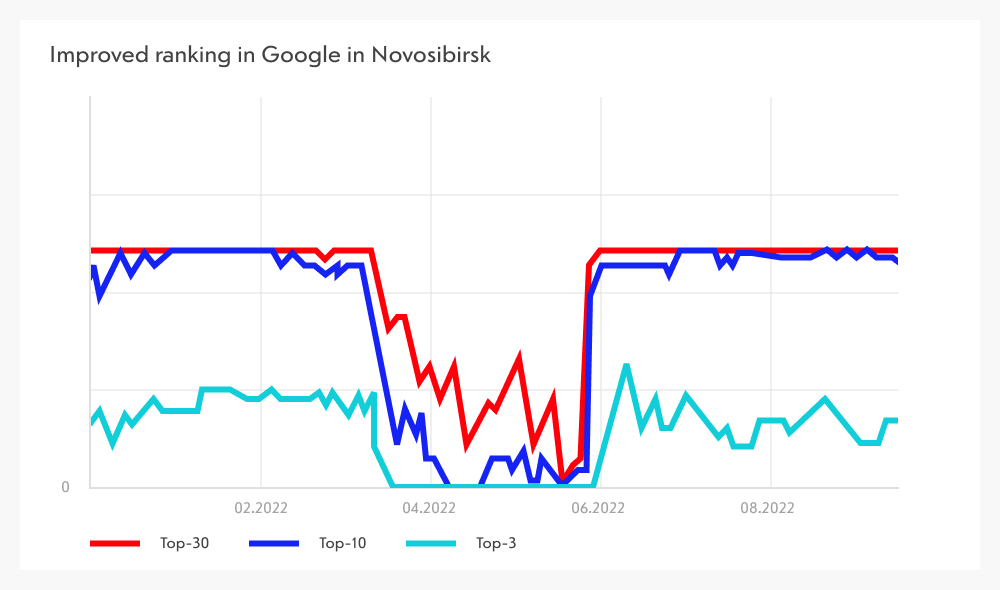 After six months, the SEO efforts for Novosibirsk and Saint Petersburg were paused, and the focus shifted to other regions. The results for Novosibirsk during this period are shown on the graph.