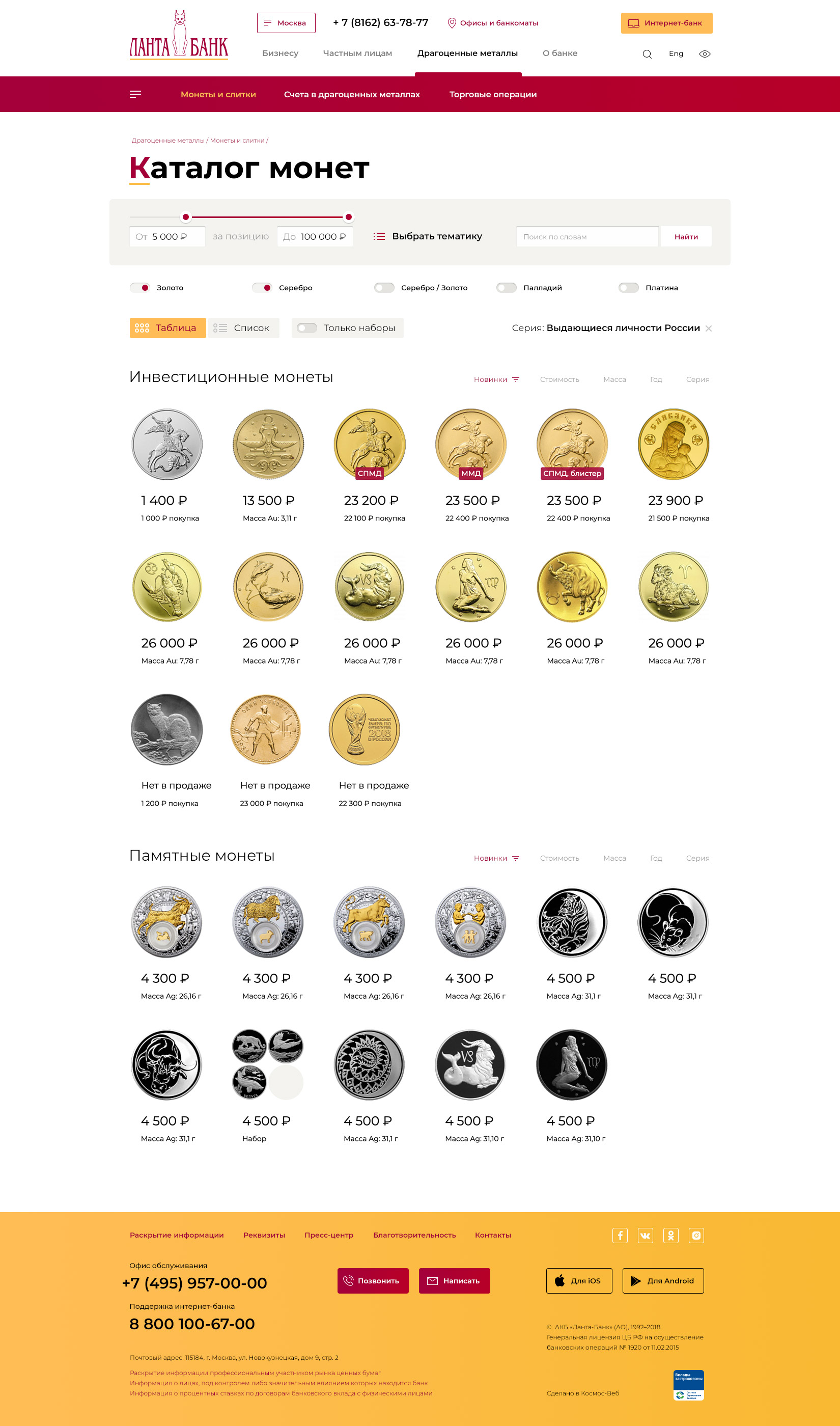 For one of the main bank’s activities, we have made a detailed catalog of coins with a user-friendly filter and search.