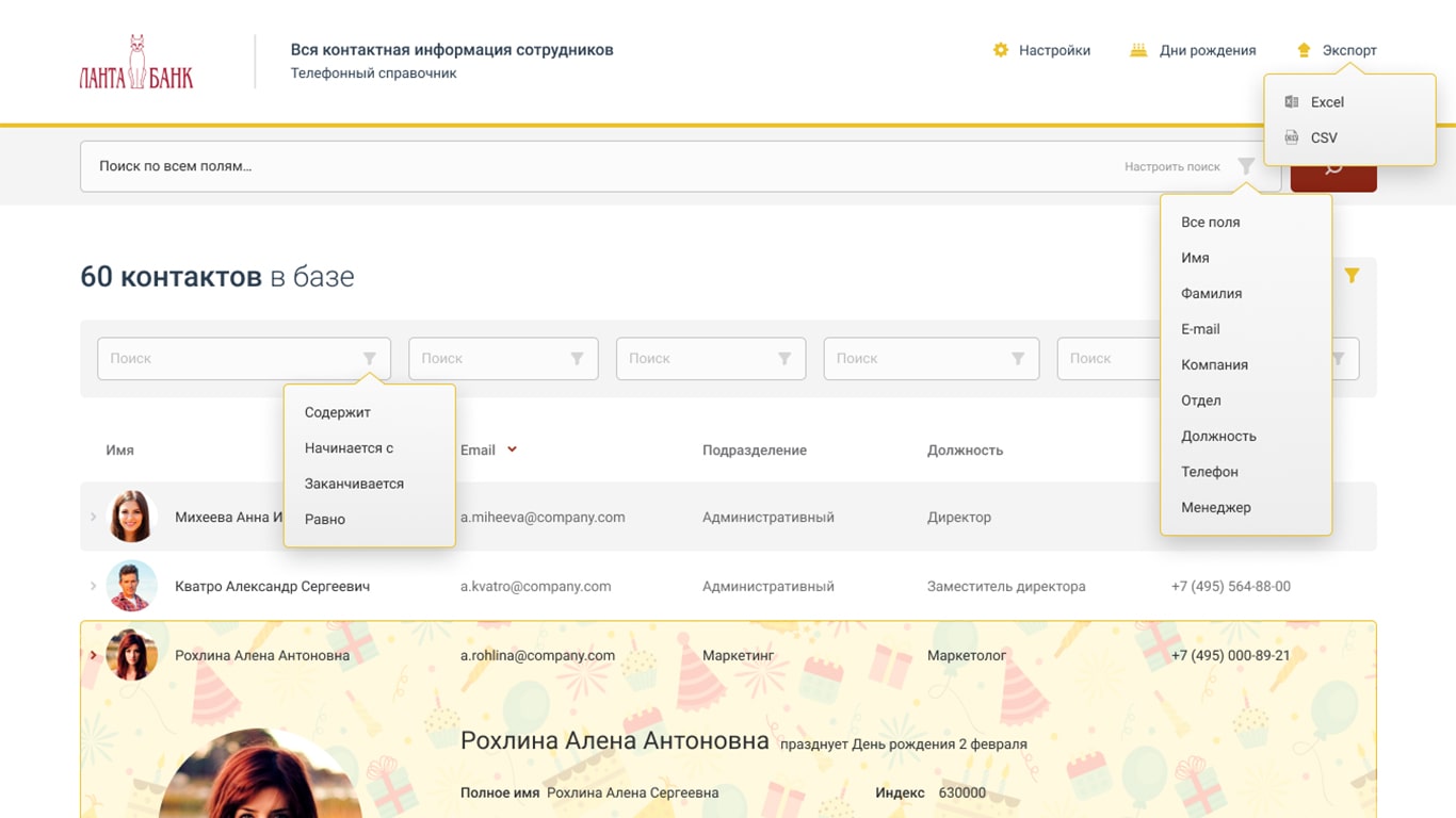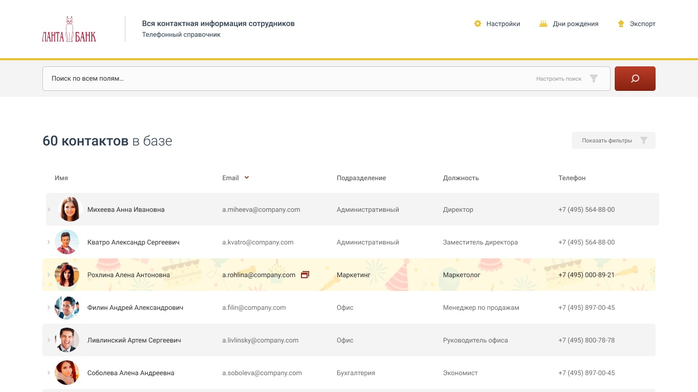 Within the system, we also created a directory with Asterisk telephony automation, Secret Santa service, and a greeting card designer. The directory and CRM are developed on Laravel framework.