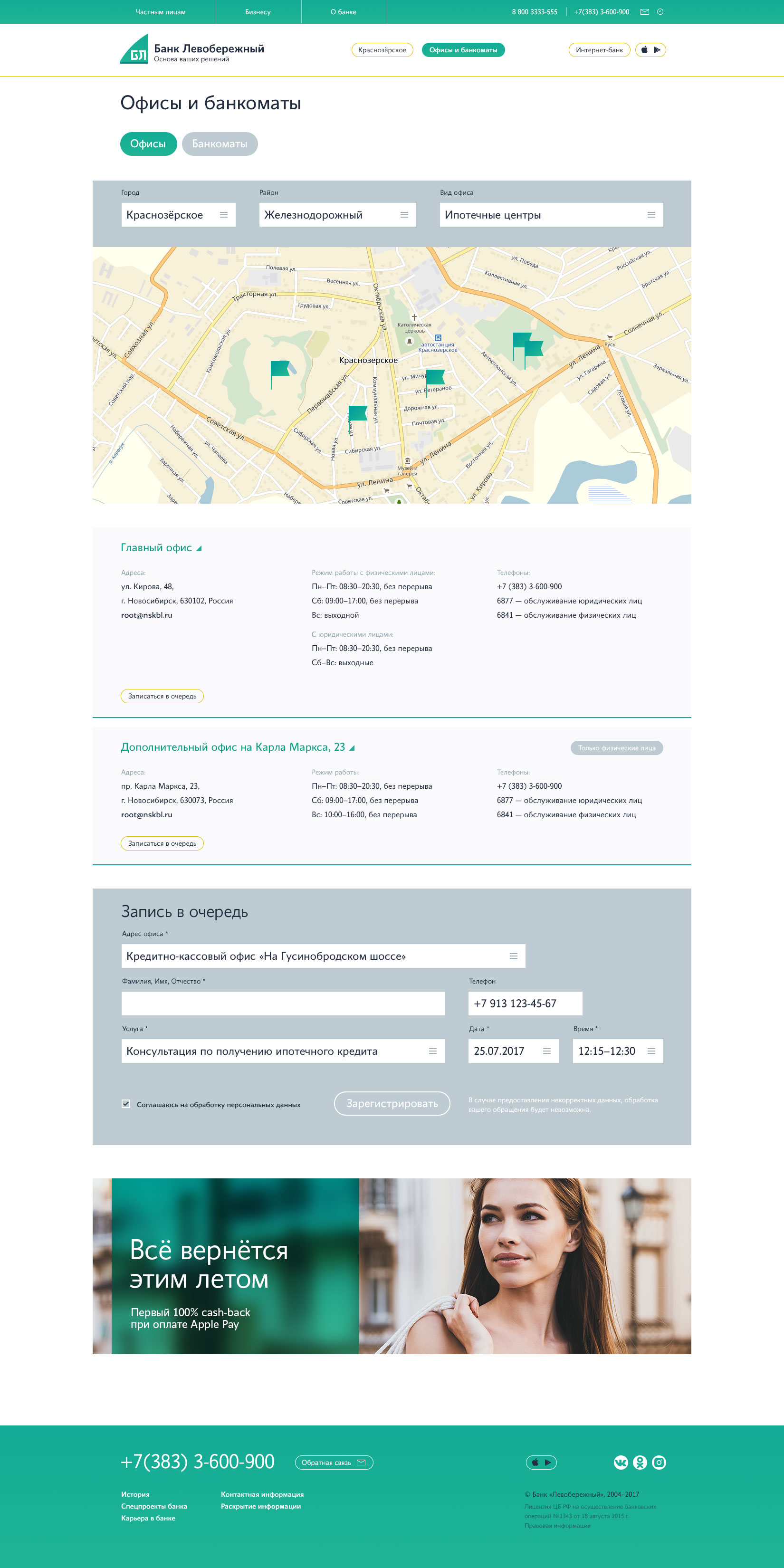 Geo-dependence of the bank’s services and contacts; loan and deposit calculators; multi-level system for distributing user accesses for editing information; integration with the client’s internal systems: displaying advanced credit and deposit parameters based on the region, uploading leads from feedback forms in CRM; version for the visually impaired users; responsive layout optimized for the mobile devices.