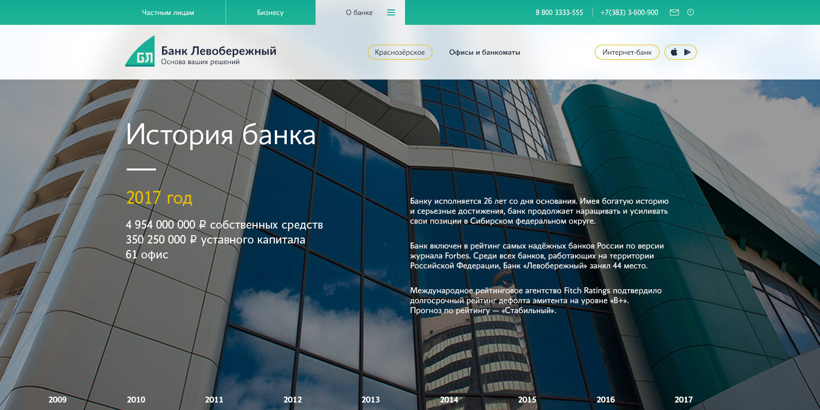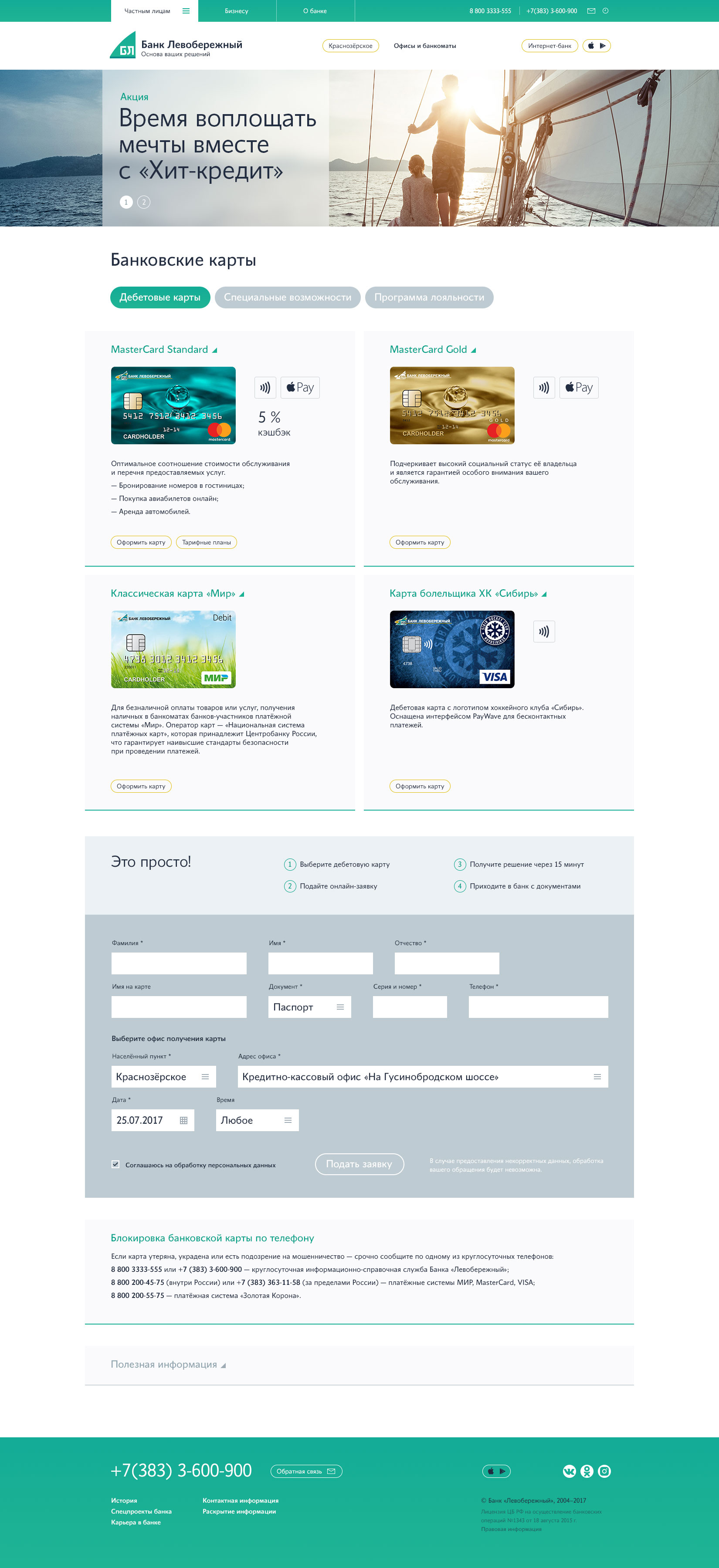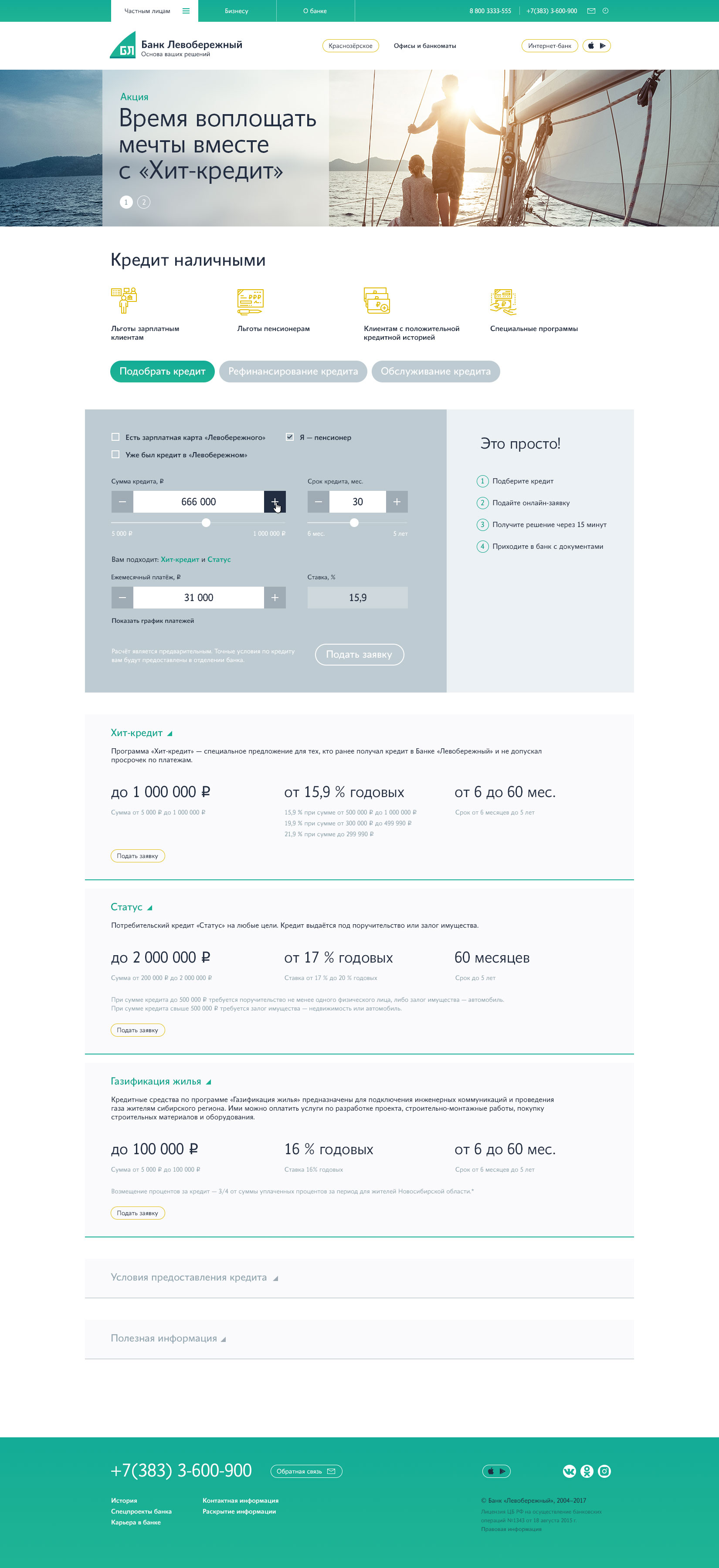 Geo-dependence of the bank’s services and contacts; loan and deposit calculators; multi-level system for distributing user accesses for editing information; integration with the client’s internal systems: displaying advanced credit and deposit parameters based on the region, uploading leads from feedback forms in CRM; version for the visually impaired users; responsive layout optimized for the mobile devices.