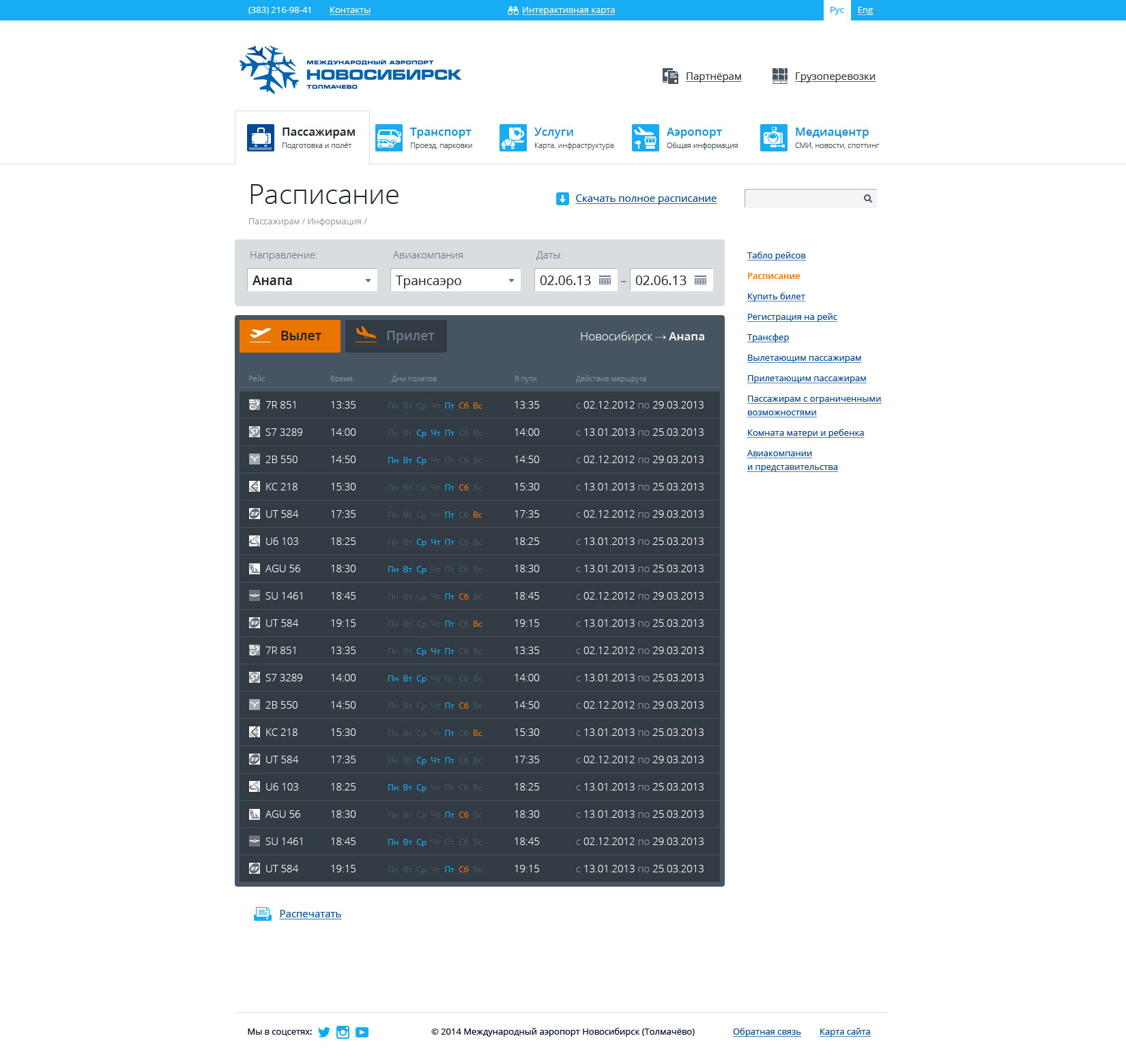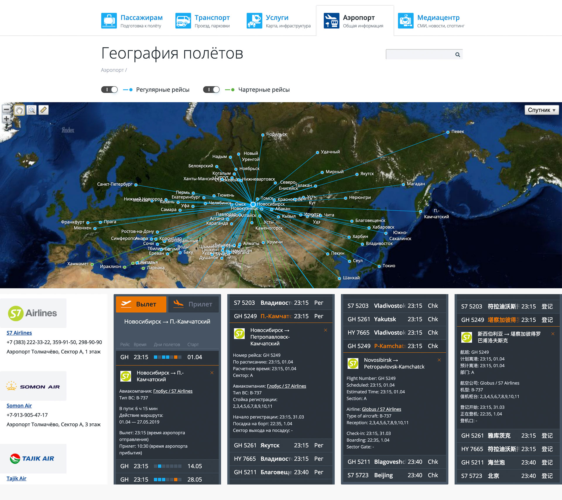 The airports use one of two flight board management systems: ’Aeroinform’ or ’Cobra’. We studied the specifics of each and configured integration with the websites via XML file exchange.