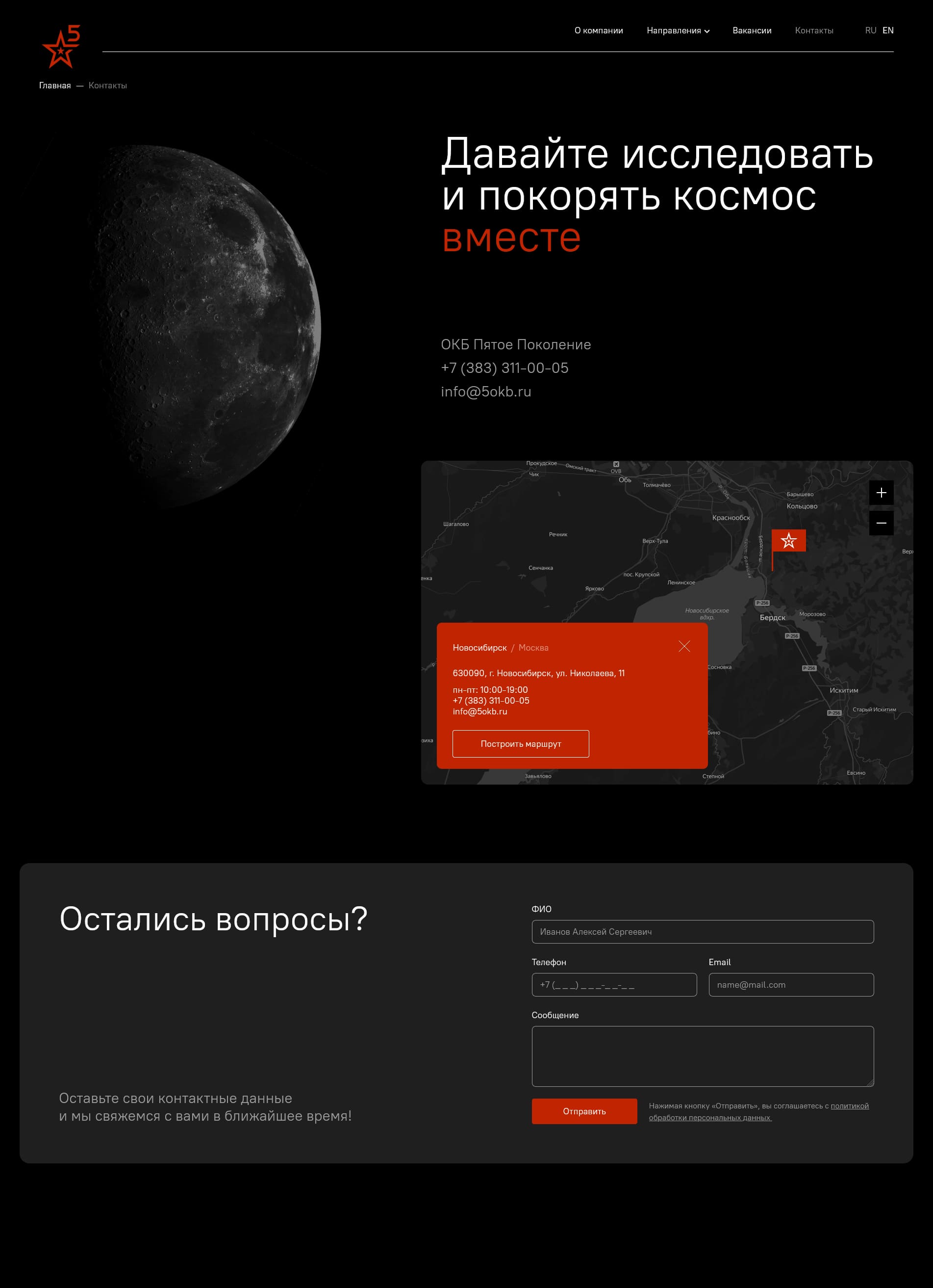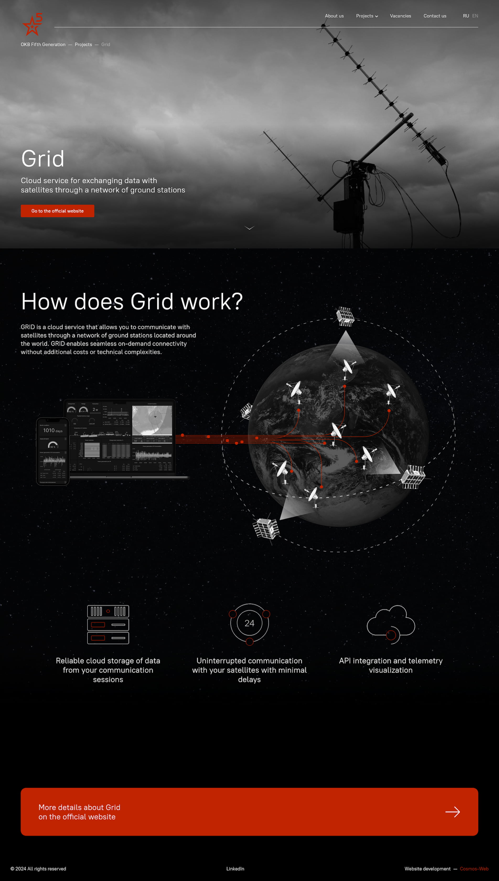 Large, non-standard layout and typography help to place accents and highlight the main thing. Dark colors and smooth scrolling animations transport the user to a place where everyone can touch space.