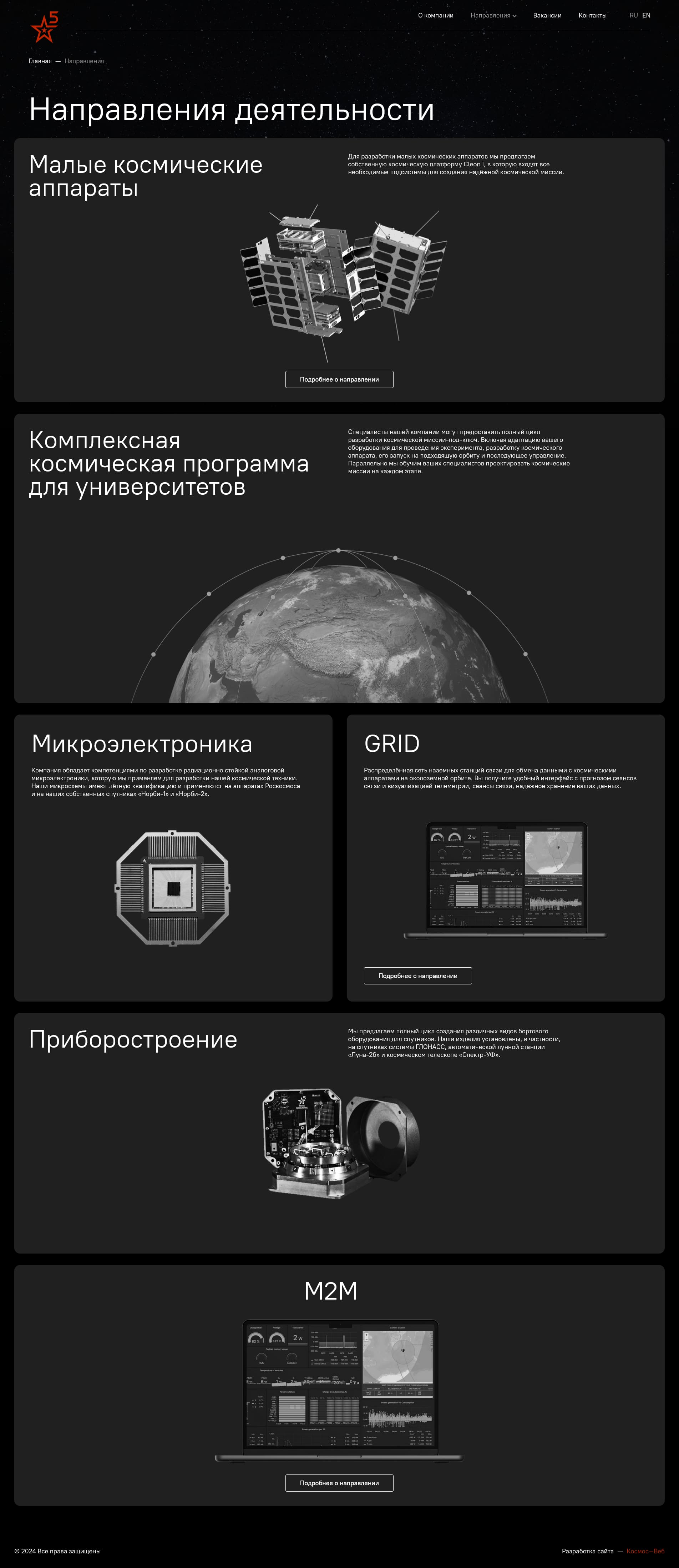 It is associated with deep darkness and bright stars, so we chose saturated dark shades for the website and placed accents in the company’s bright corporate colors.