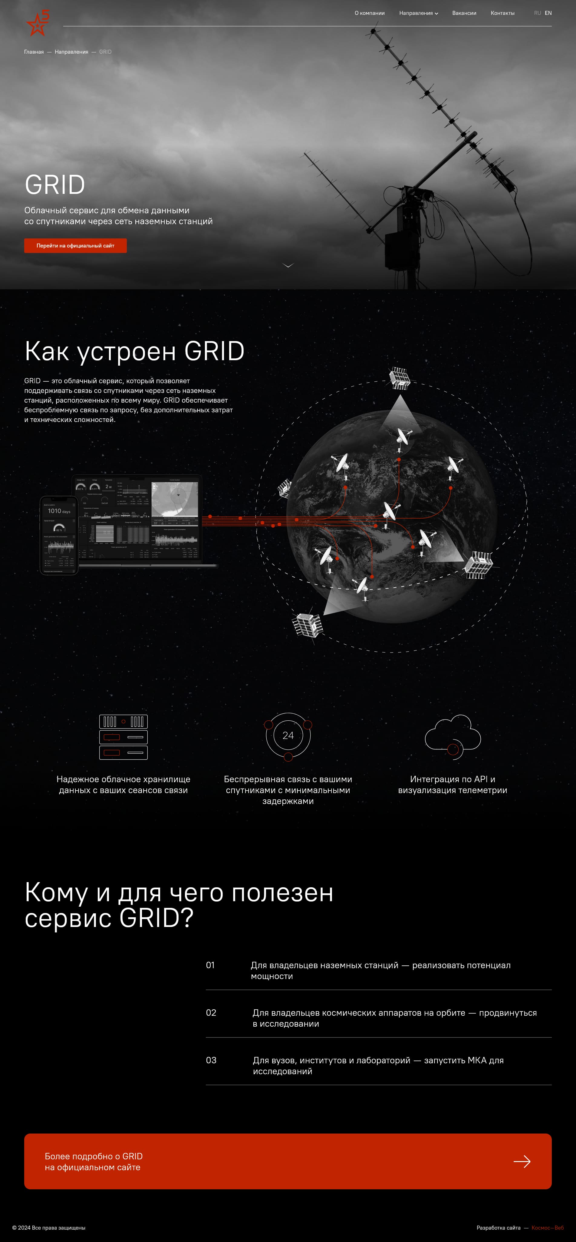Large, non-standard layout and typography help to place accents and highlight the main thing. Dark colors and smooth scrolling animations transport the user to a place where everyone can touch space.