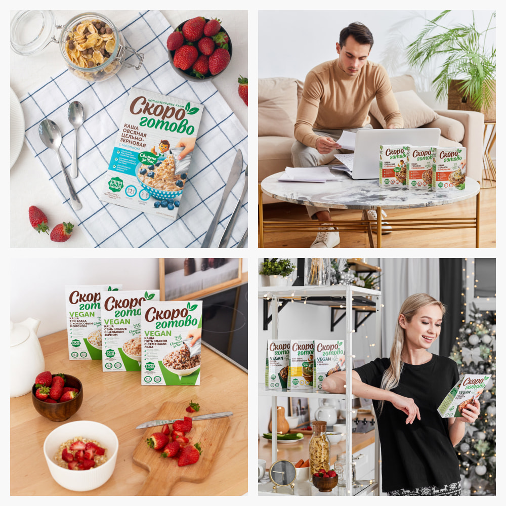The packaging should be in the center of the frame, so we chose the location in bright colors. For the most visual composition of the products, we used fresh vegetables, cereals, fruits and berries, which are the key ingredients.