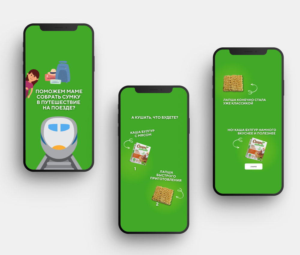 The contents of the product were shown through the environment, color, and mood. In the beginning, there was a lot of green, but we found a balance with it a little later: the design became calmer, and the green acted only as a connecting element.