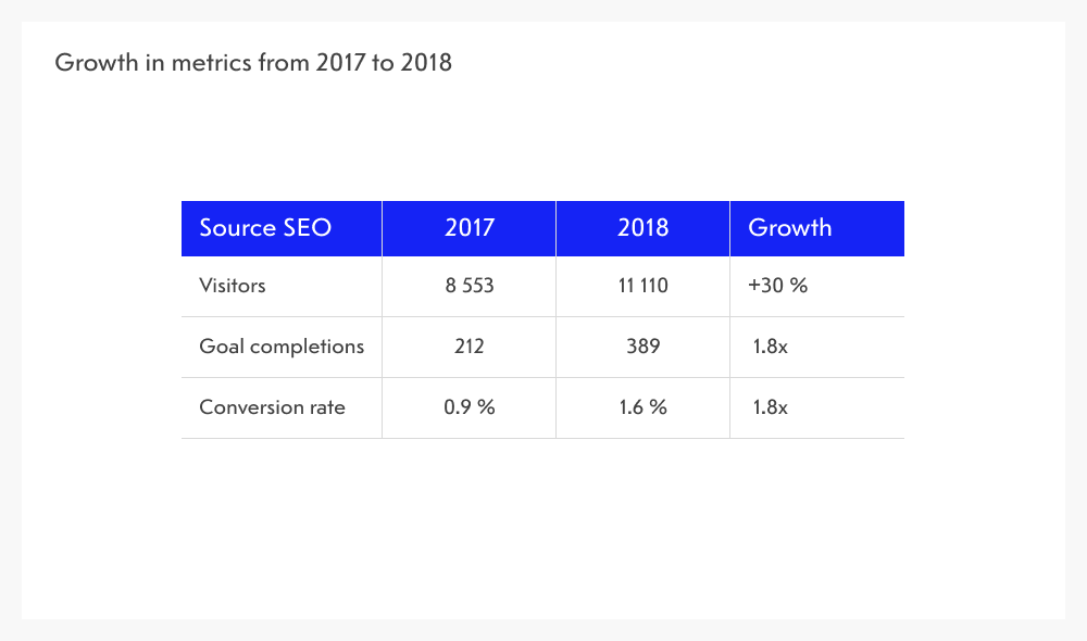 We also increased CTR from 0.46% to 0.76% in Yandex and increased the number of ad clicks by 77% in Google.