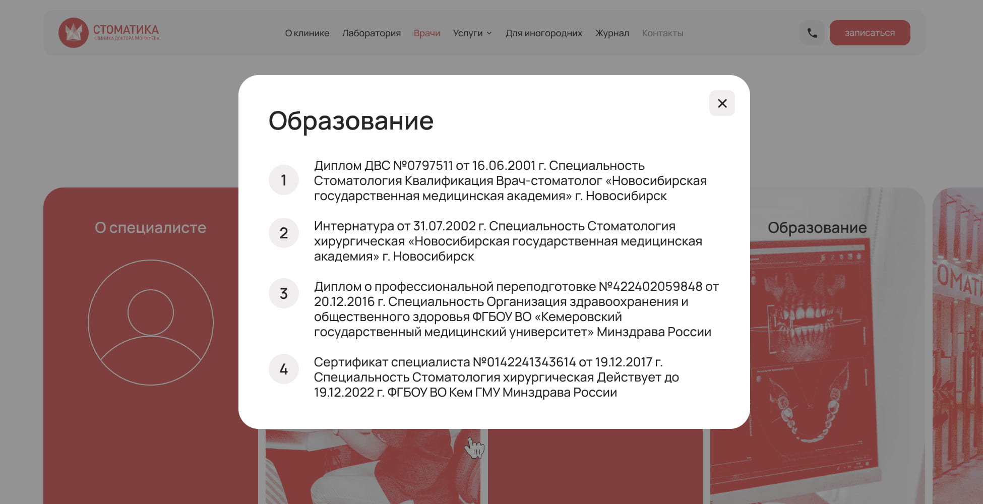 Each of the doctors has a special approach and manner of communication. The specialist’s card contains information about the regalia, hobbies and personal qualities of the doctor. There is a video where the doctor talks about himself informally, for close acquaintance.