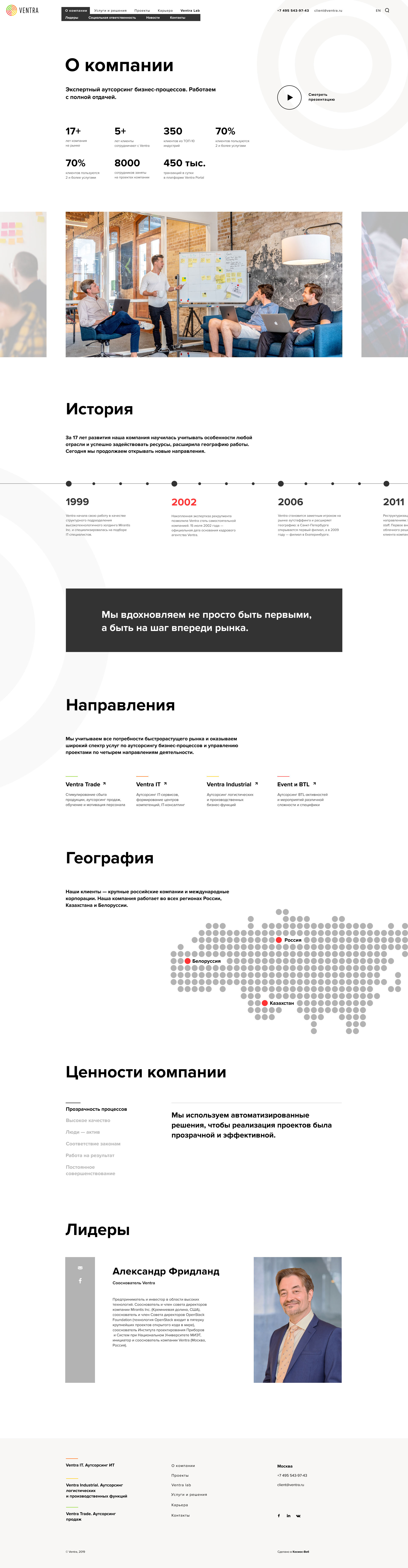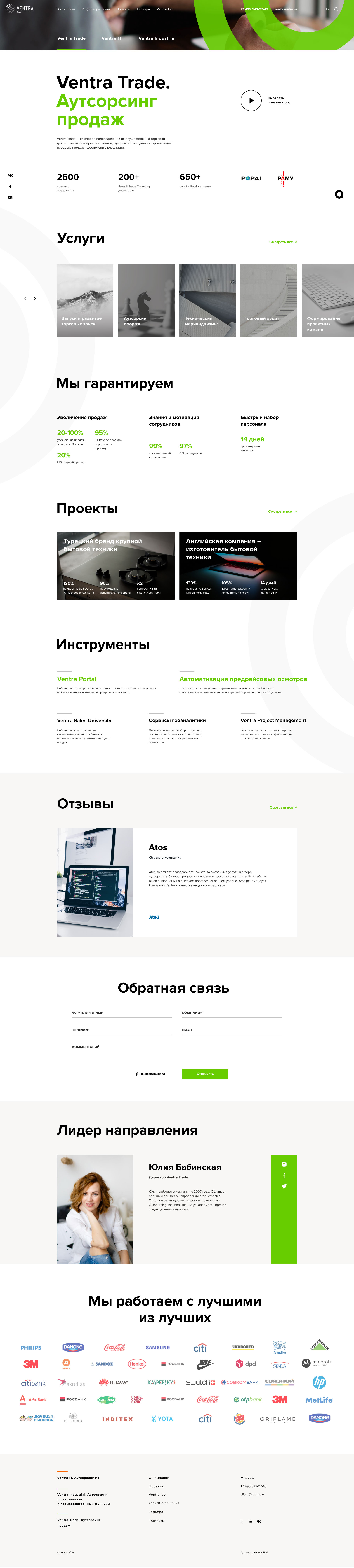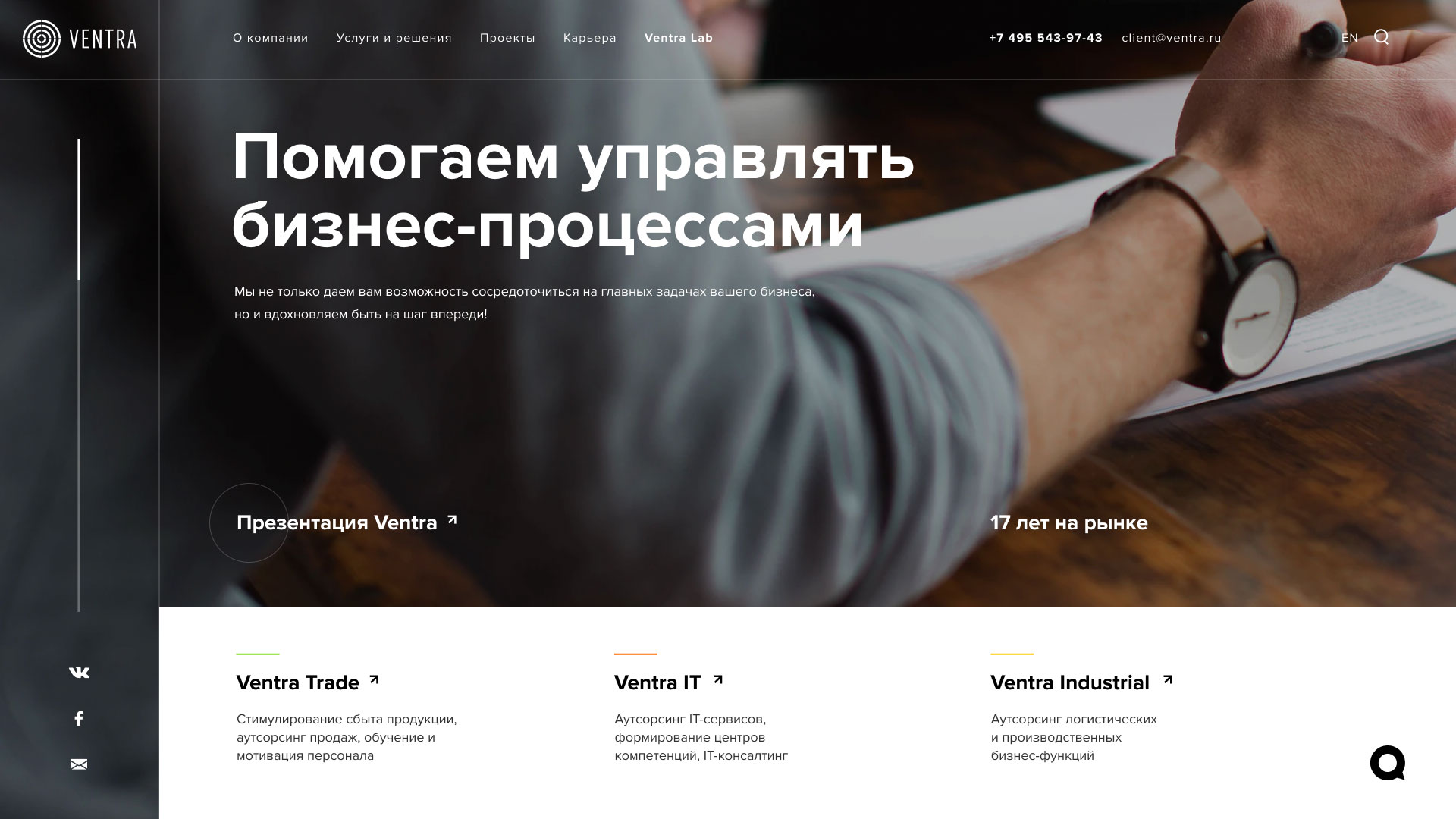 There are many service lines — and the website attracts a diverse audience. To ensure the best user experience, we highlighted the main directions on the first screen: Ventra Trade, Ventra IT, Ventra Industrial.