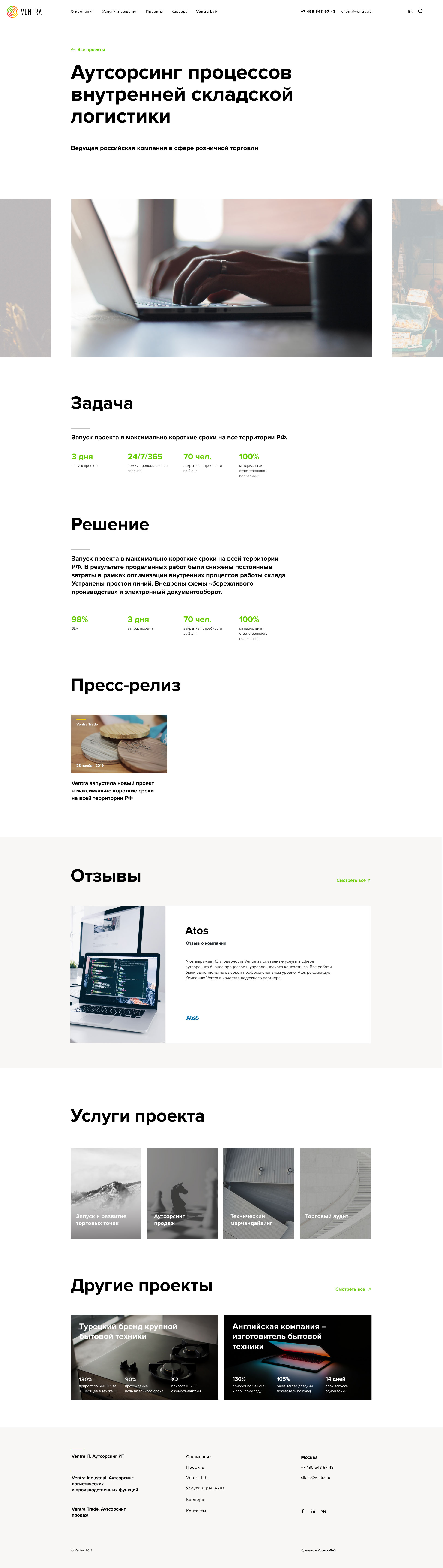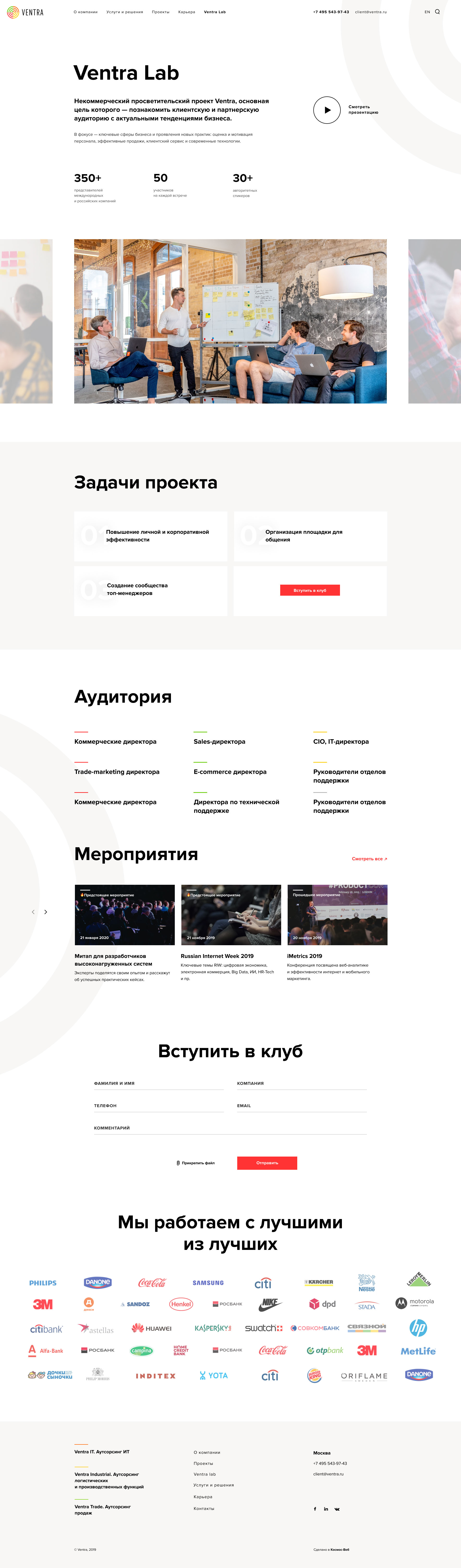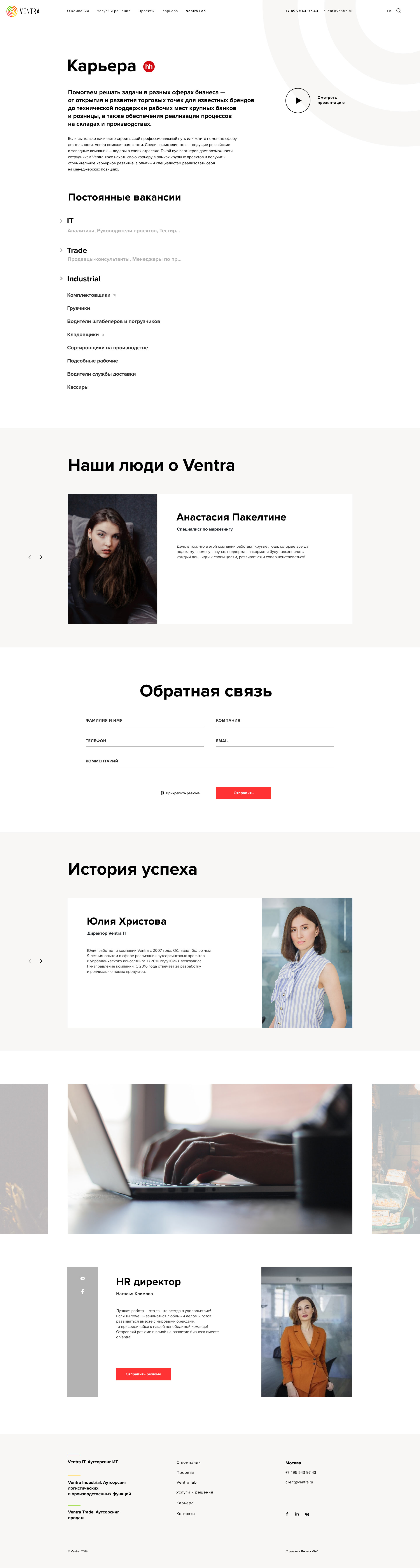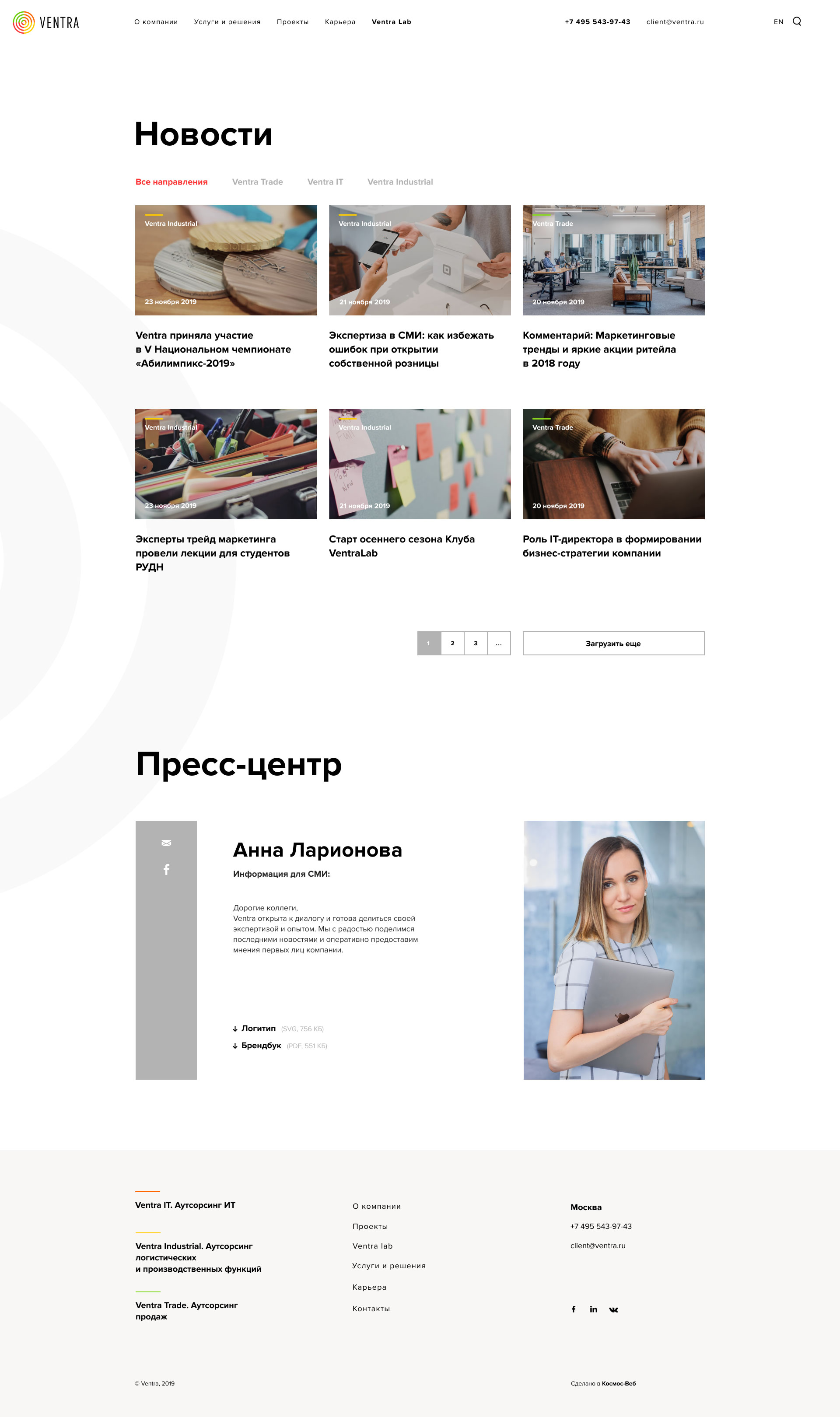 There are many service lines — and the website attracts a diverse audience. To ensure the best user experience, we highlighted the main directions on the first screen: Ventra Trade, Ventra IT, Ventra Industrial.