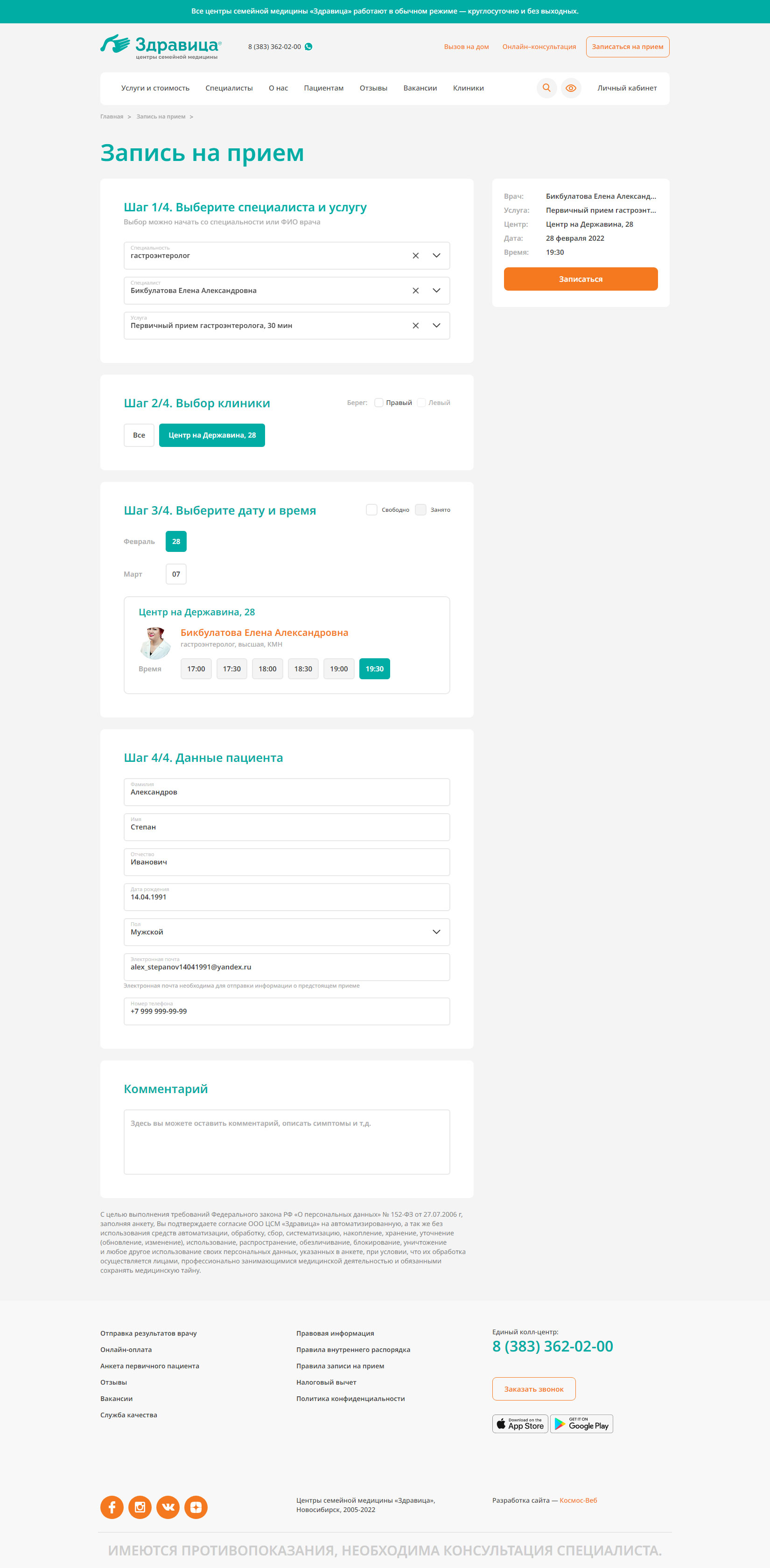 On the ’Make an Appointment’ page, users can select a medical specialty, a specific doctor, and a service. The system then suggests appropriate clinics along with available time slots.